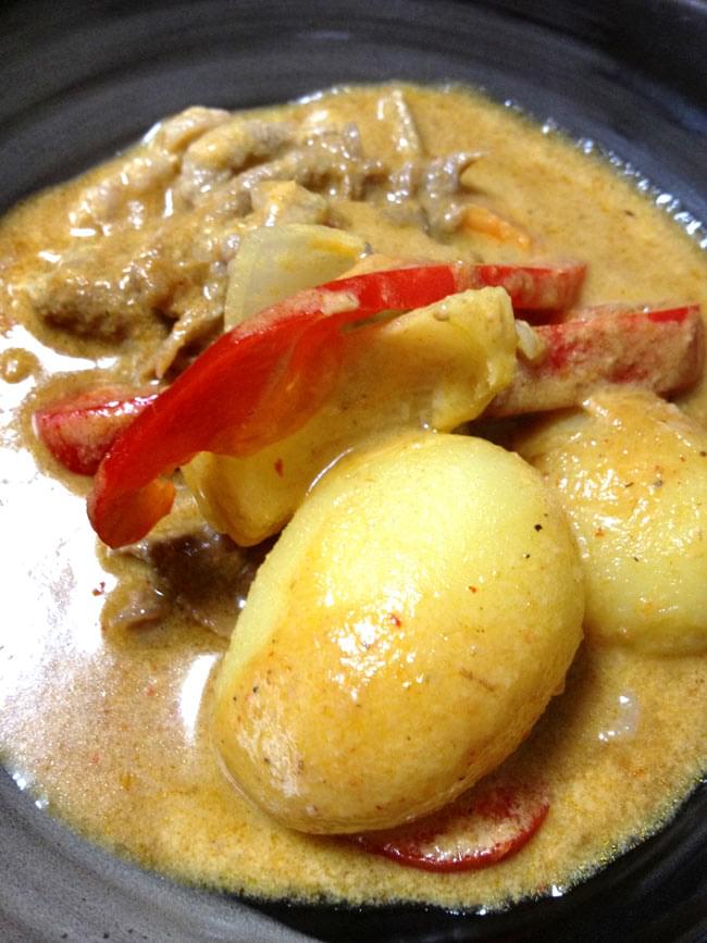 作ってみました。タイのカレーにしては、甘々でちょっと酸味が有って絶妙な美味しさ。最後に砂糖とタマリンドペーストを大量に入れますが、お好みで増減して下さい。