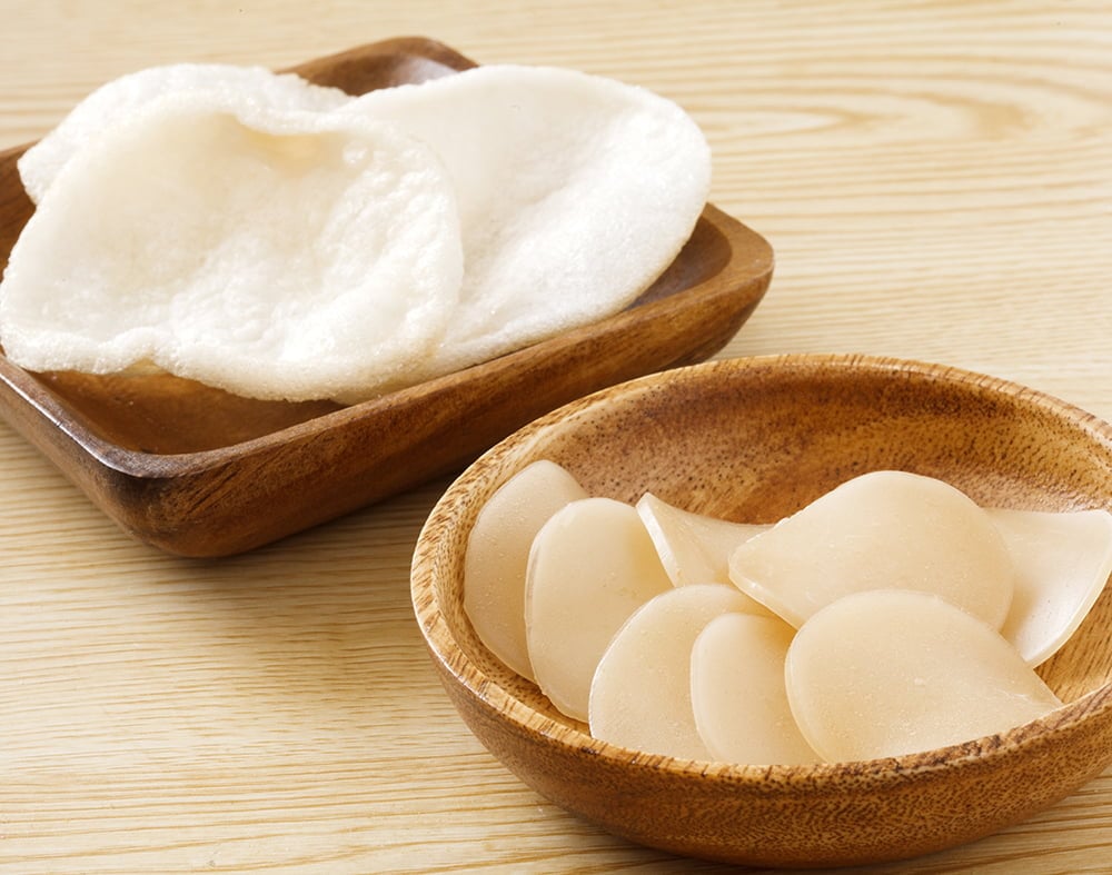 キャッサバの根茎(芋)から採った澱粉(タピオカ)に、海老や魚のすり身などを混ぜ合わせ、薄くのして乾燥させて作っています。ブランドは違いますが、中華街でよく売っている海老煎餅と同一です。