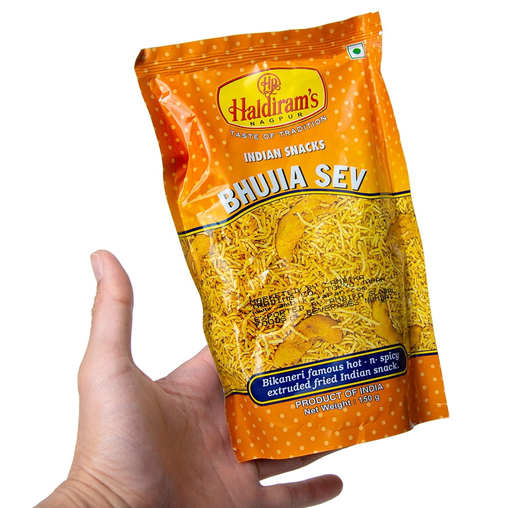 Bhujia Sev(ブジア セヴ)とは、砂漠の国ラジャスタン州のお菓子タウン ビカネール地域で人気のヌードルスナックです。ひよこ豆の粉を練って生地にし、その生地を押し出すようにして作った麺をカラッと揚げたお菓子です。そのまま食べてももちろん美味しいですが、インドやネパールでは、カットした玉ねぎやコリアンダー、トマトなどの野菜と混ぜてサラダにして使うことも多いですね。インド人視点ではサラダですが、日本の視点から見ると、「ビールのおつまみにぴったり!」な感じになります。