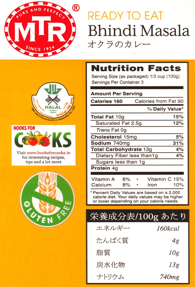 ![Bhindi Masala - オクラのカレー 10個セット[MTRカレー] 3 - 栄養成分表です。インドハラル認証、グルテンフリーなどなど。](https://www.tirakita.com/food/Photos/set_food_70_3b.jpg)