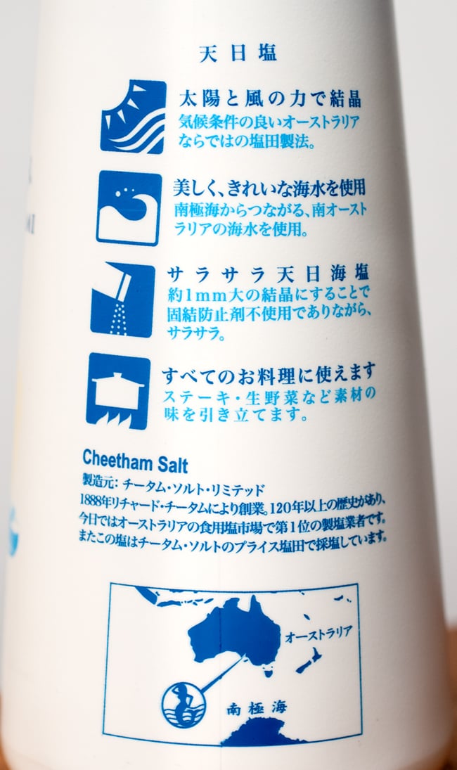 広大なオーストラリアの塩田で南極海につながるオーストラリアの美しくきれいな海水を太陽と風でゆっくりと天日干しし結晶にしたものを丁寧に粉砕しました。天日塩は、固結防止剤不使用でありながらサラサラとボトルから出るように結晶粒を約1mmサイズの結晶にしています。全てのお料理に使え、ステーキ、生野菜等の素材の味を引き立てます。ぜひ、自然の恵みを味わってみてください。 」■CHEETHAM SALT