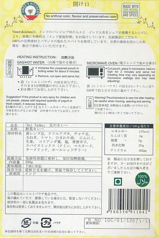 | 原材料名 | 黄レンズ豆、ケツルアズキ、チャナ豆玉ねぎ、トマト、ひまわり油、にんにく、生姜、コリアンダー葉、塩、青トウガラシ、スパイスミックス(クミン、マスタード、ターメリックホールレッドチリ) |