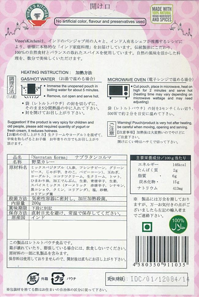 | 原材料名 | ミッ クスベジタブル(人参、フレンチビーン、グリンピース、じゃがいも、きのこ、ベビーコーン)玉ねぎ、ヨーグルト、ココナッツクリーム、生クリーム、トマ ト、ひまわり油、加工でんぷん、生姜、青トウガラシ、スパイスミックス(ターメリック、赤とうがらし、シナモン、黒胡椒、クミン、コリアンダー)塩、砂 糖、コリアンダー葉 |