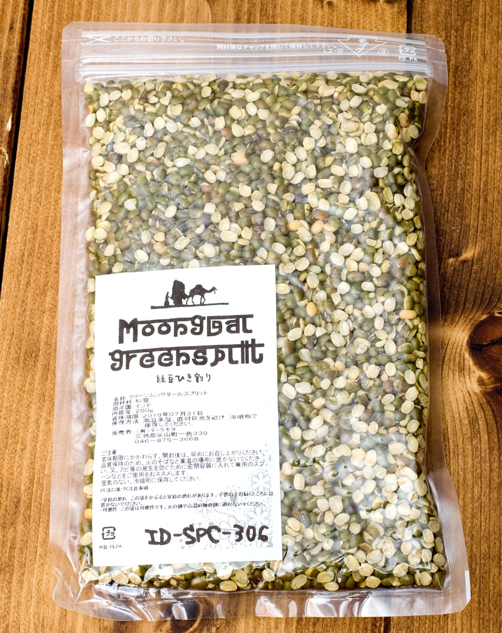 縦割りのムング豆250gパックです。インドではカレー、スープなどに使われます。縦に割ってありますので、吸水や下ゆで等の処理をせず料理に使えますので、大変便利です。