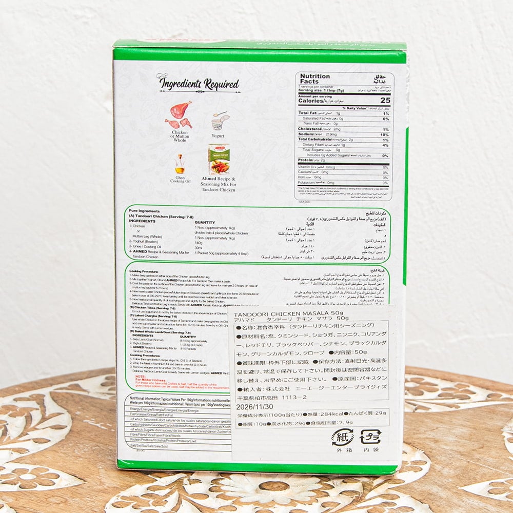 インド料理といえばまずタンドリーチキンを思い浮かべる人も多いのではないでしょうか。こちらのスパイスミックスはそんなタンドリーチキンをパキスタン風に気軽に作れるスパイスミックスになっています。美味しさに定評あるAHMED社秘伝のスパイスの配合を是非、お試しください。■外箱が潰れていることがあります。すいません。