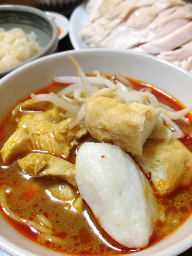シンガポールやマレーシアでよく見られる太めの麺にココナッツ風味のスパイシーなスープでいただく「ラクサ」。シンガポールやマレーシアの屋台では、ラクサを注文すると、「どれ入れる?」と好きな具材をチョイス。炒めたり焼いたり温めてくれてそれをラクサにトッピングしていただきます。