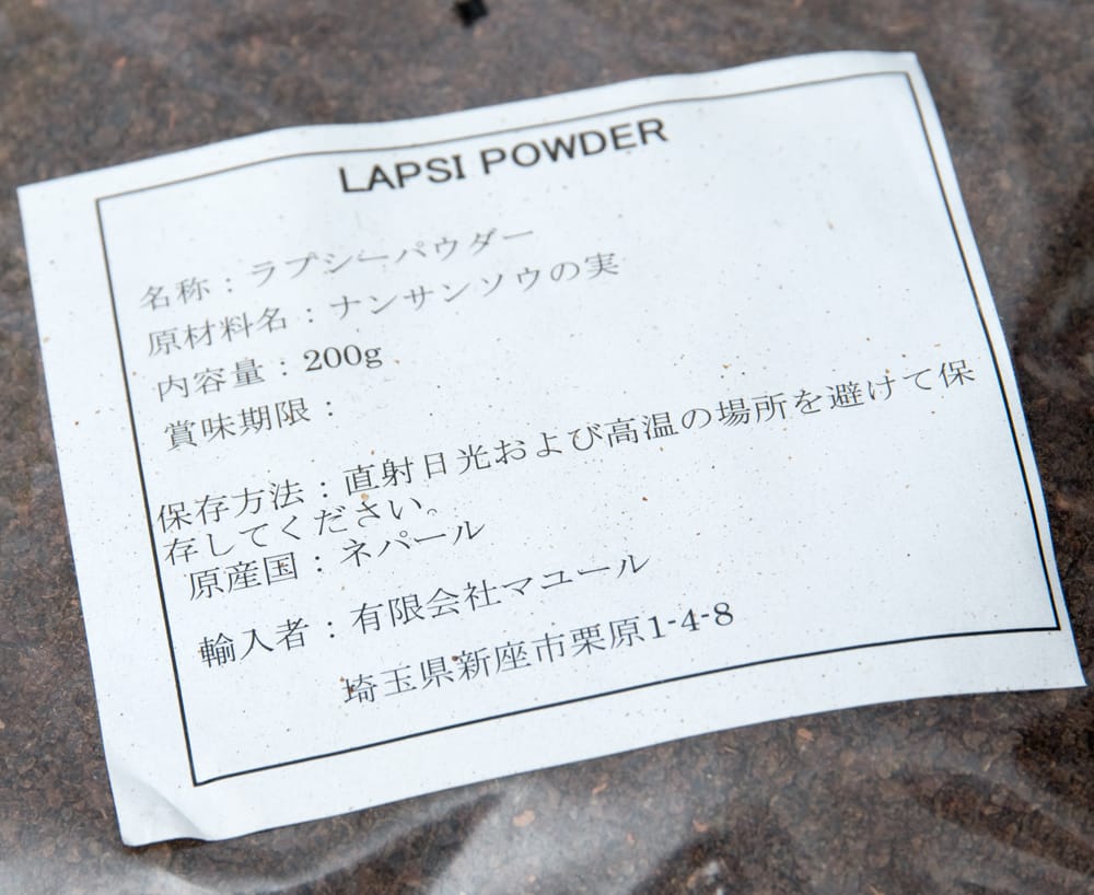 ラプシ(Lapsi)とは、ネパール原産の果物で、このラプシーパウダー(LAPSI POWDER)は、ラプシの実を乾燥させて粉状にしたものです。ラプシ(Lapsi)は非常に酸っぱく、ビタミンCが非常に豊富。生の状態では、なかなか実と種を分離するのが難しいのですが、一度、熱を加えると容易に分離できます。