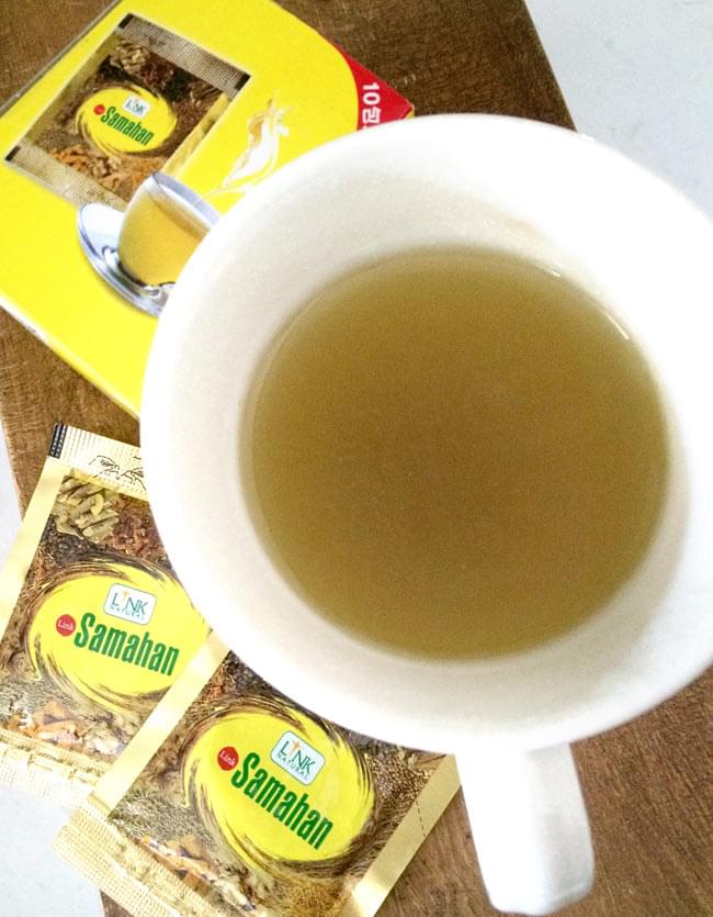 サマハンはスリランカで古くから飲み続けれられているスパイスやハーブをブレンドしたお茶です。ウィッシュヌクランティ、シリテーク、ファルスカルンバ、ジンジャー、アダトダ、バッバーダガム、イエローベリードナイトジェイド、ロングペッパー、ジャヴァガランガル、ブラックペッパー、クミン、アジョワン、コリアンダー、リコリスの14種類のスパイスやハーブをブレンド。溶けやすい顆粒タイプにしました。