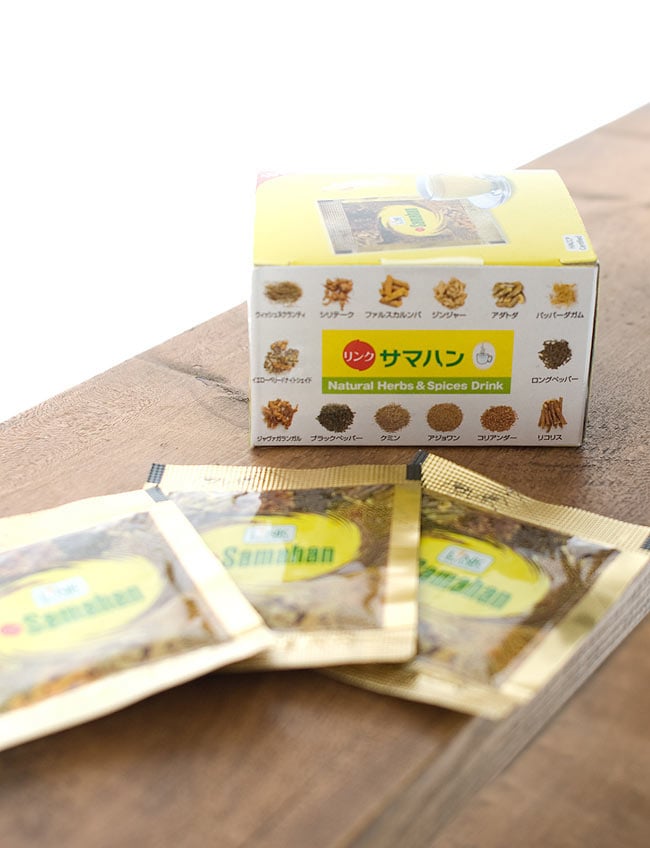 サマハンはスリランカで古くから飲み続けれられているスパイスやハーブをブレンドしたお茶です。ウィッシュヌクランティ、シリテーク、ファルスカルンバ、ジンジャー、アダトダ、バッバーダガム、イエローベリードナイトジェイド、ロングペッパー、ジャヴァガランガル、ブラックペッパー、クミン、アジョワン、コリアンダー、リコリスの14種類のスパイスやハーブをブレンド。溶けやすい顆粒タイプにしました。