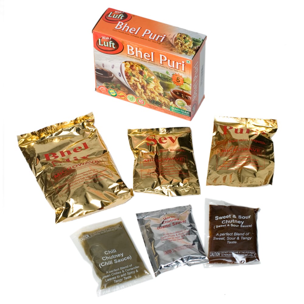 電車の中などで売りに来るインドの有名なストリートフード、ベルプリがついにあなたの家でも楽しめるようになった革命的な一品です。インドで食べる際は、ストリートフードだけあって、衛生面をだいぶ気にしながら食べますが、こちらのキットであれば、お腹を壊す心配はありません。箱の中には丸い板っぽいプリ、インド版ベビースターのセヴ、インドのポン菓子Bhel Miv、そしてコリアンダーソースやチリソースなど3種が入っています。