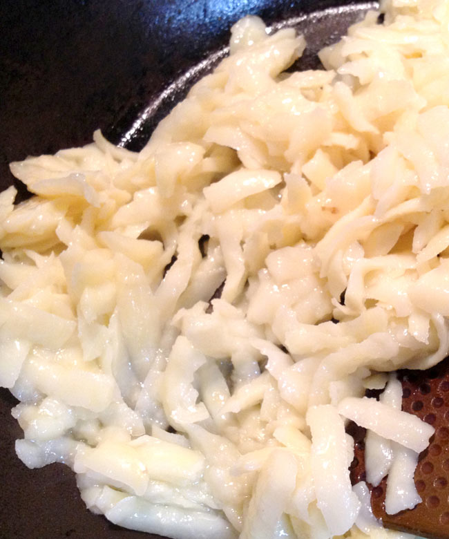パウチを開けてフライパンで焼くだけでスイス料理が出来あがり。チーズと一緒に焼いたらもっとおいしいかも。