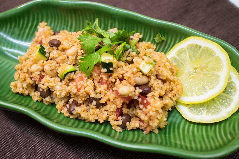 調理例。挽き割りのブルグルと和えてサラダ仕立てにしてみました。