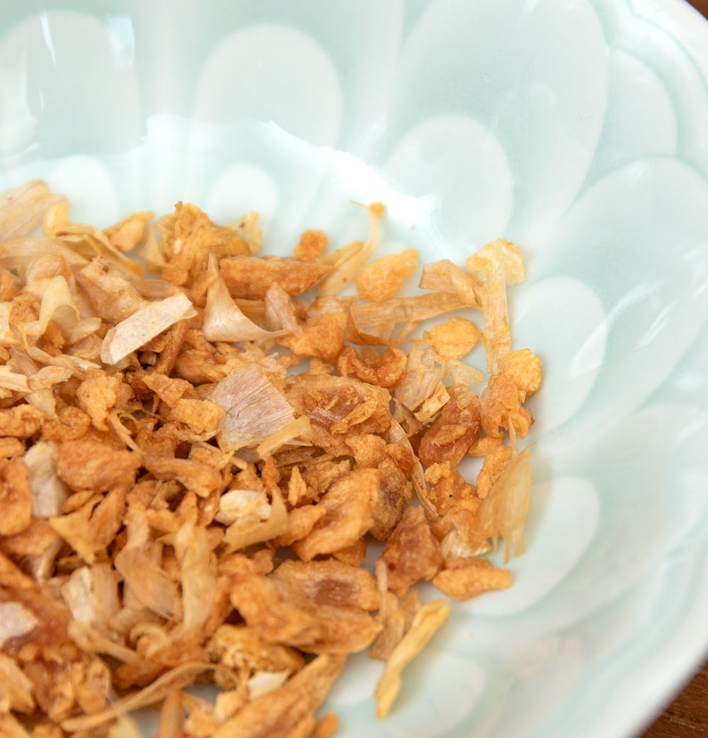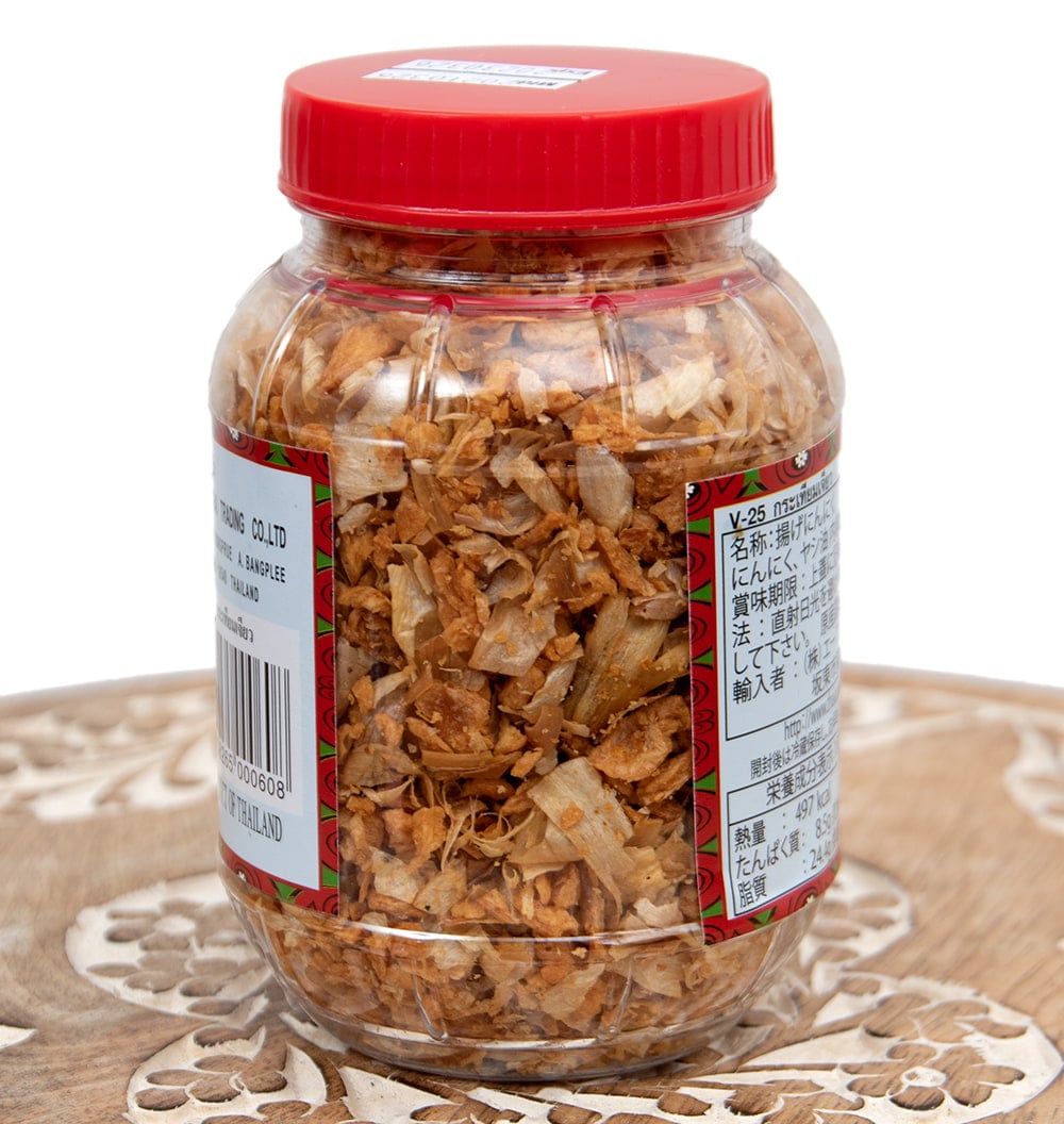パパっと振りかけるだけで、香ばしいにんにくの味がつけられるタイの揚げにんにくです。にんにくを剥いて、薄くスライスし、やし油でシンプルにカラッと揚げてあります。蓋を開けると素晴らしいにんにくの香りがふんわりと香り、食欲が増すこと請け合いです。