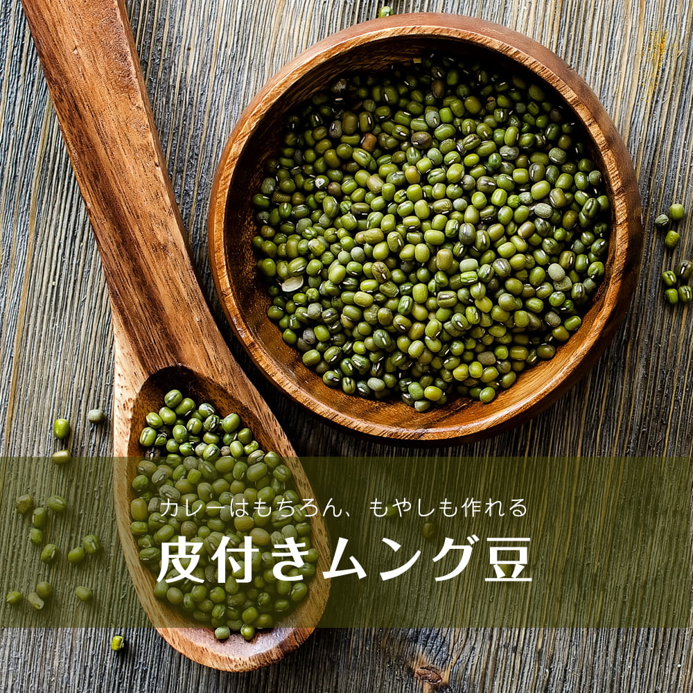 皮付きムング豆です。インド料理では皮付きムング豆でもやしを作ってサブジを作ったりします。皮付きと皮なしを使い分けます。こちらは、お得な1kg入りの大容量。「たくさん食べたい!!」「毎日食べる」と言う方やレストランなどで業務用としても、用途に合わせてお使いいただけます。