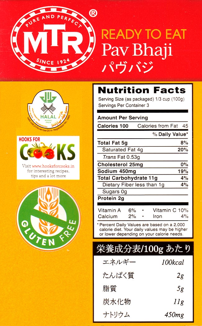 ![Pav Bhaji - ジャガイモと野菜のカレー 10個セット[MTRカレー] 3 - 栄養成分表です。インドハラル認証、グルテンフリーなどなど。](https://www.tirakita.com/food/Photos/set_food_73_3b.jpg)