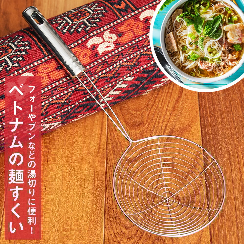 フランスの影響が名残をのこすベトナムでは、西洋とアジア双方の料理が融合しています。ハーブをふんだんに用いた香り高い料理が特徴的ですが、「フォー」や「ブン」といった麺類はとりわけ名高いです。旨味の効いたスープに、優しい舌触りの米麺が組み合わさって日本人にも嬉しい美味しさです。こちらの麺すくいはそんなベトナムで用いられている本場仕様そのもの。もちろん、ベトナム料理にかぎらずあらゆる国籍の料理にお使いいただけます。ぜひキッチンアイテムの一つとしてご利用くださいませ。