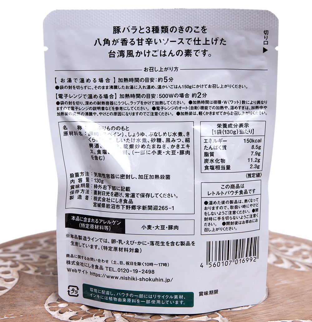 | 原材料・成分 | 豚肉(スペイン)、しょうゆ、ぶなしめじ水煮、きくらげ水煮、しいたけ水煮、砂糖、黒みつ、紹興酒、でん粉、乾燥炒めたまねぎ、かきエキス、食塩、香辛料、(一部に小麦・大豆・豚肉を含む) |