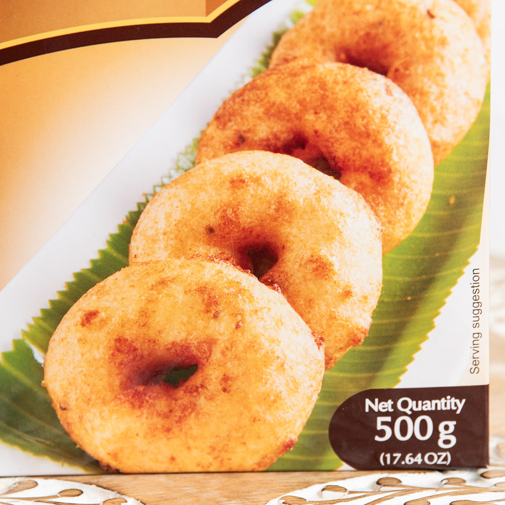 「ワダvada」は南インドのティファンの一つです。ウラドダルをやわらかくすりつぶした生地を小さいドーナツ型に揚げたもので、「サンバル」や「チャトニ」を添えて食べるのがメジャー。ちょっと小腹が空いたときなどに気軽につまめるティファン(軽食)です。ドーナツ型ではありますが甘さはありません。この生地をゼロからつくるとだいぶ大変なのですが、こちらはそんな手間を大幅に省いてくれる便利キットです。水と混ぜてフライするだけ!