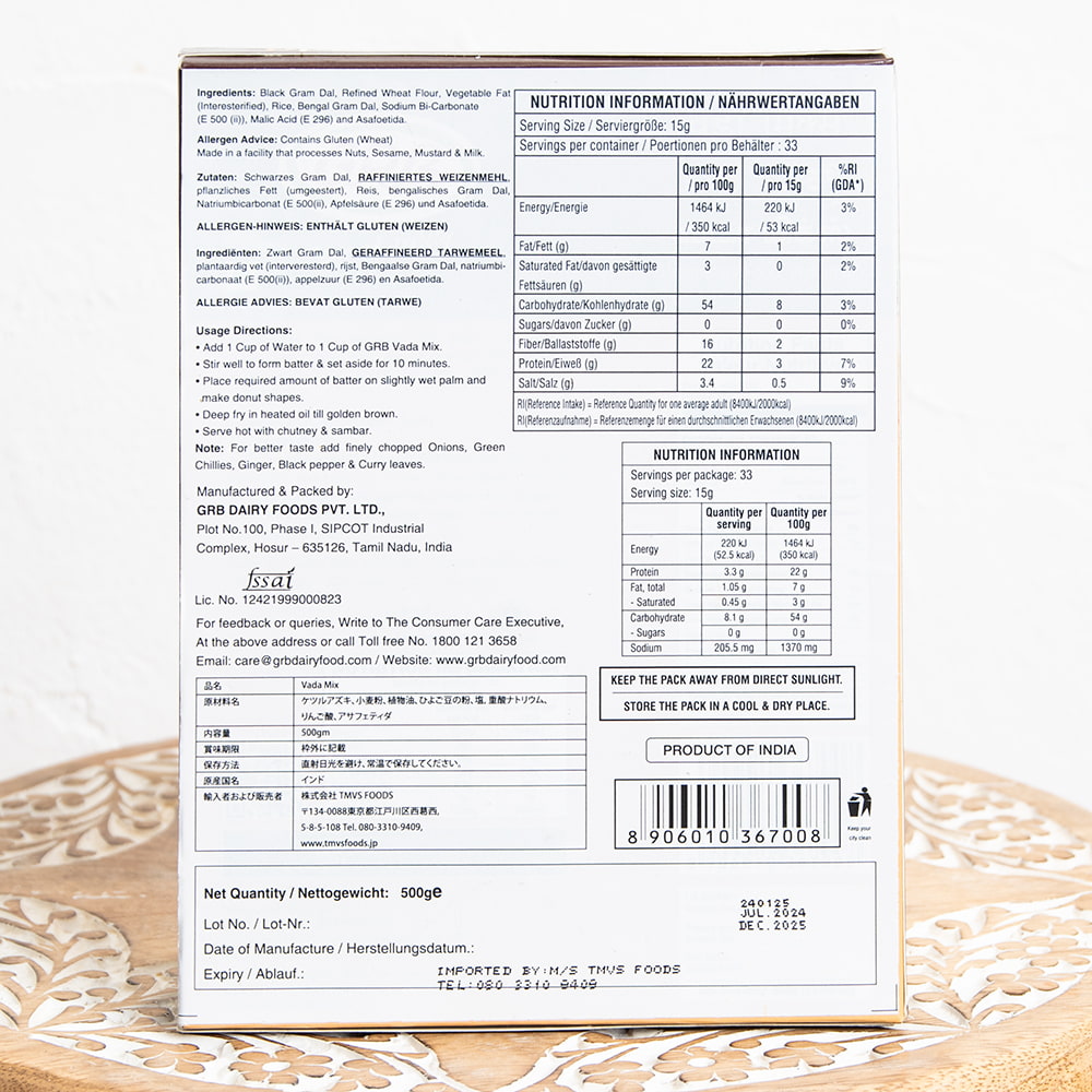 インド南部・カルナータカ州の州都バンガロールに本社を置くGRB社。ギーをはじめとする高品質な乳製品で有名なブランドですが、サンバルやドーサといった南インドアイテムも幅広く展開しています。南インドで作られた、南インド人向けの本格的な味わいをお楽しみいただけます。| 原材料・成分 | ケツルアアズキ、小麦粉、植物油、ひよこ豆の粉、塩、重酸ナトリウム |