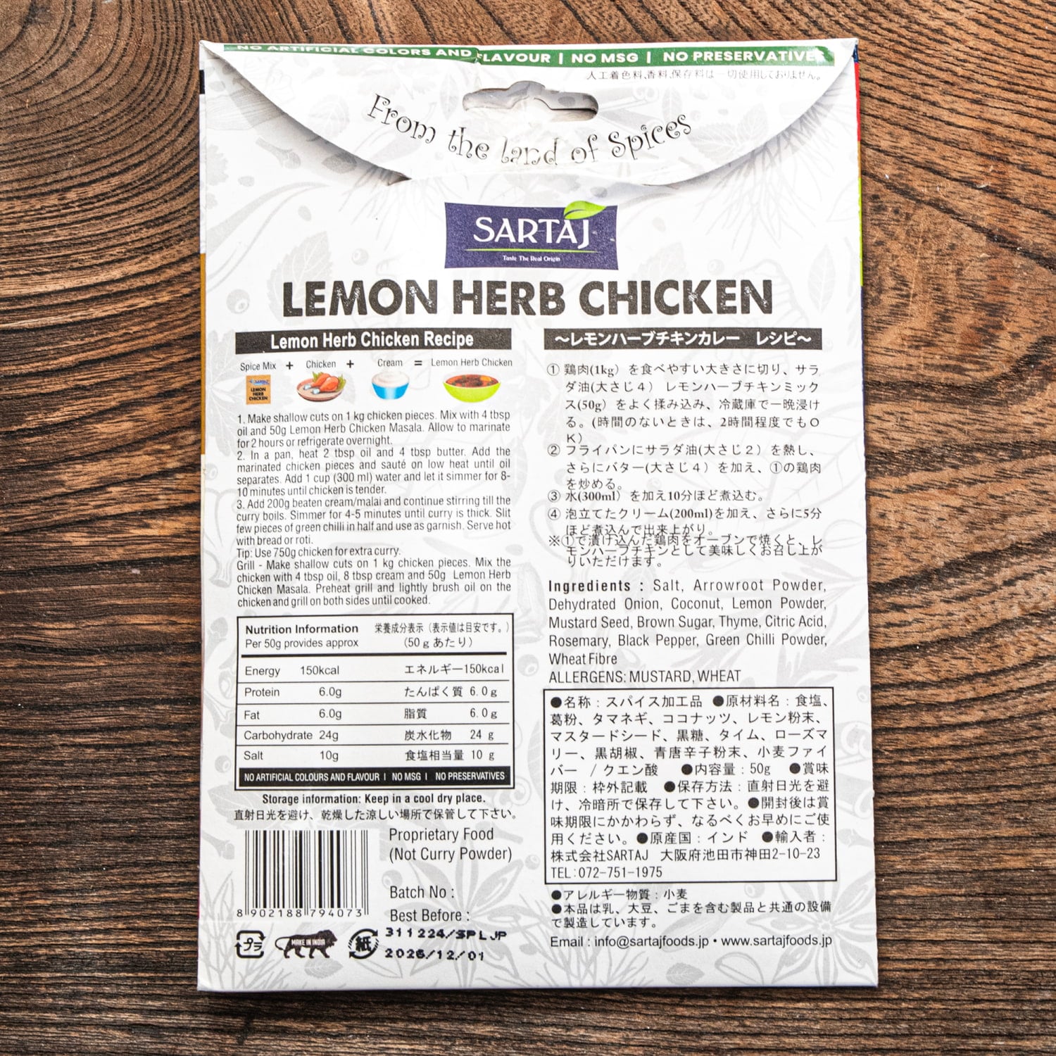| 原材料・成分 | 食塩、葛粉、タマネギ、ココナッツ、レモン粉末、マスタードシード、黒糖、タイム、ローズマリー、黒胡椒、青唐辛子粉末、小麦ファイバー、/クエン酸 |