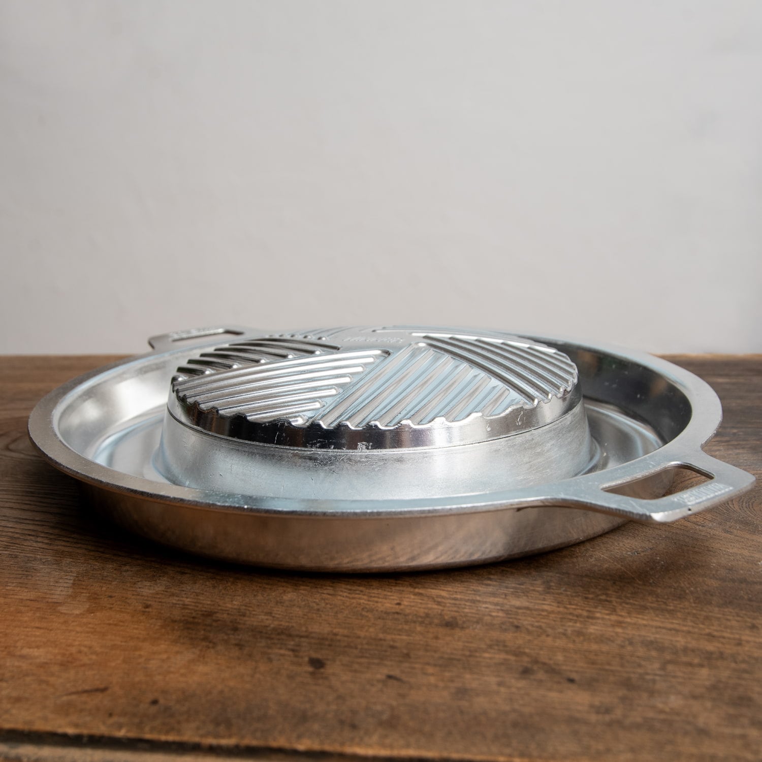 こちらのムーガタ鍋、一風変わっているのは、中央部のお肉を焼く所が被せ蓋状になっていて、簡単に取り外せるようになっていること。焦げ付きがちな部分も洗い流しやすい、とっても便利なお鍋になっています。見た目はごっついですがアルミ製なのでとても軽くできています。現地で使用される際は、主に熱した炭を炭台に満たし上に網を敷いて、その上にこちらを乗せて使われています。カセットコンロで使われる場合もあります。