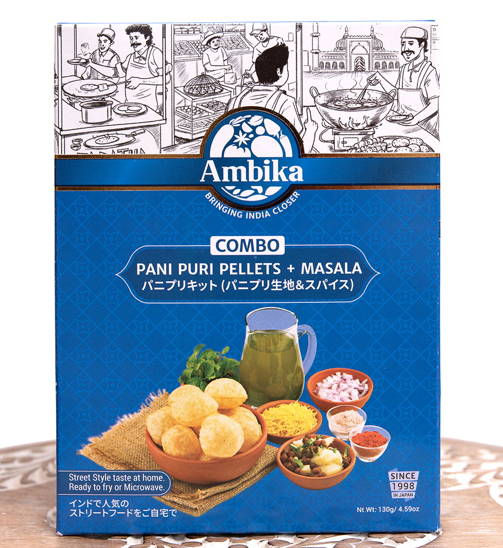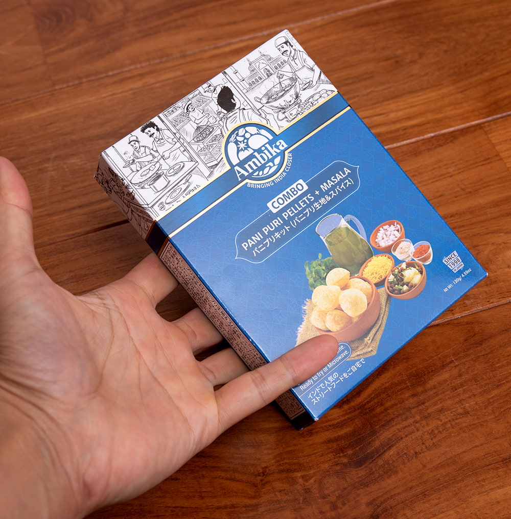 インドで人気の軽食パニプリを自宅で気軽に作る事が出来る、箱入りパニプリキットです。クリスピーなプリ(シェル/殻)の元になるパニプリフライアムと、中へ入れる辛くて酸っぱいパニ(水)を作るためのマサラがセットになっているのでお家で気軽にパニプリを楽しめます。