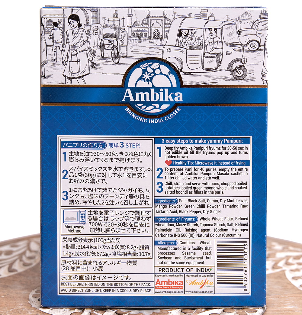 | 原材料・成分 | 【パニプリ生地】小麦粉、コーンスターチ、タピオカスターチ、食塩、パームオレイン/膨張剤、ターメリック色素、【スパイスミックス】食塩、クミン、マンゴー、タマリンド、グリーンチリ、ミント、黒こしょう、しょうが/DL-酒石酸 |