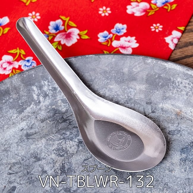 フランスの影響が名残をのこすベトナムでは、西洋とアジア双方の料理が融合しています。ハーブをふんだんに用いた香り高い料理が特徴的ですが、「フォー」や「ブン」といった麺類はとりわけ名高いです。旨味の効いたスープに、優しい舌触りの米麺が組み合わさって日本人にも嬉しい美味しさです。こちらのレンゲはそんなベトナムで日常的に用いられているアイテムです。スープ状の食べ物が多いベトナムならではの食器ですね。小さな刻印も可愛らしく、普段使いにもぴったりです。