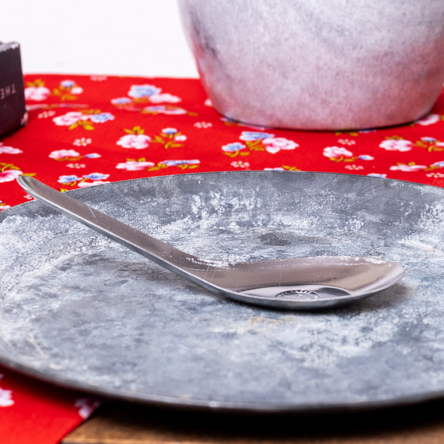 フランスの影響が名残をのこすベトナムでは、西洋とアジア双方の料理が融合しています。ハーブをふんだんに用いた香り高い料理が特徴的ですが、「フォー」や「ブン」といった麺類はとりわけ名高いです。旨味の効いたスープに、優しい舌触りの米麺が組み合わさって日本人にも嬉しい美味しさです。こちらのレンゲはそんなベトナムで日常的に用いられているアイテムです。スープ状の食べ物が多いベトナムならではの食器ですね。小さな刻印も可愛らしく、普段使いにもぴったりです。