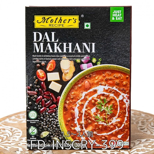 | 原材料・成分 | ウラド豆、トマト、バター、生クリーム、玉ねぎ、食塩、綿実油、澄ましバター、赤金時豆、しょうが、にんにく、青唐辛子、シナモン、カルダモン、クミン、唐辛子、フェンネル、黒胡椒 |
