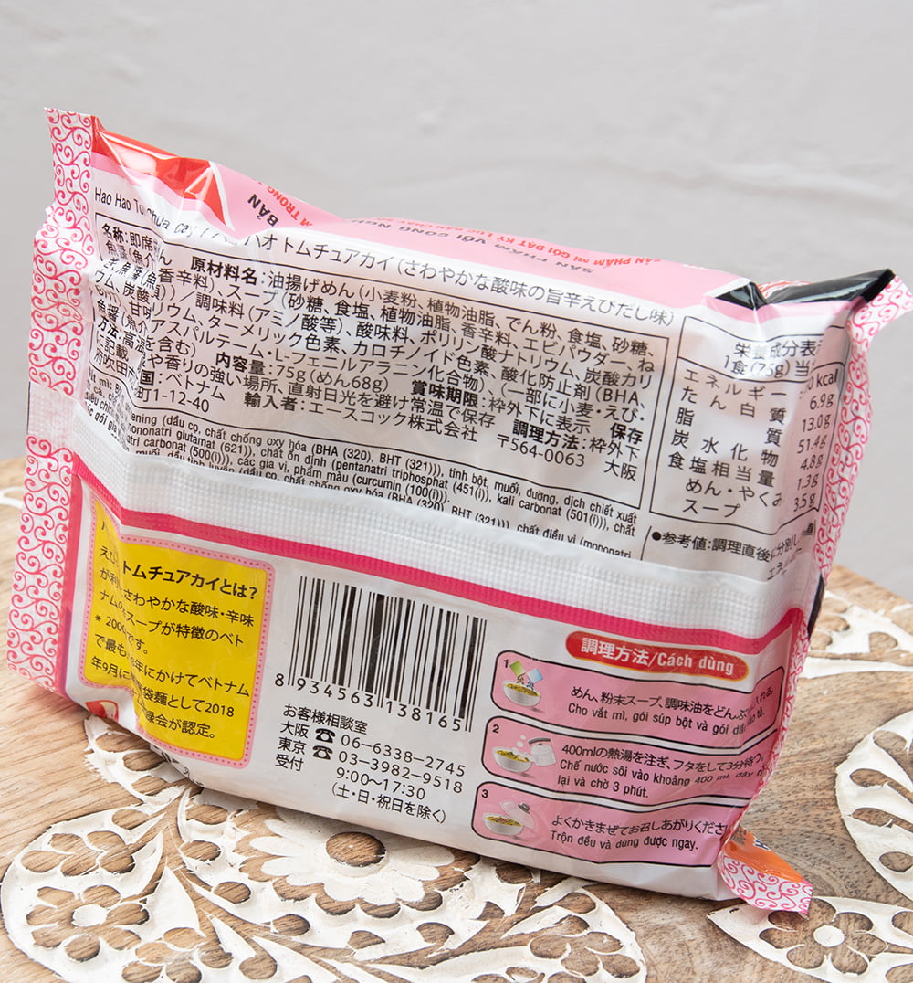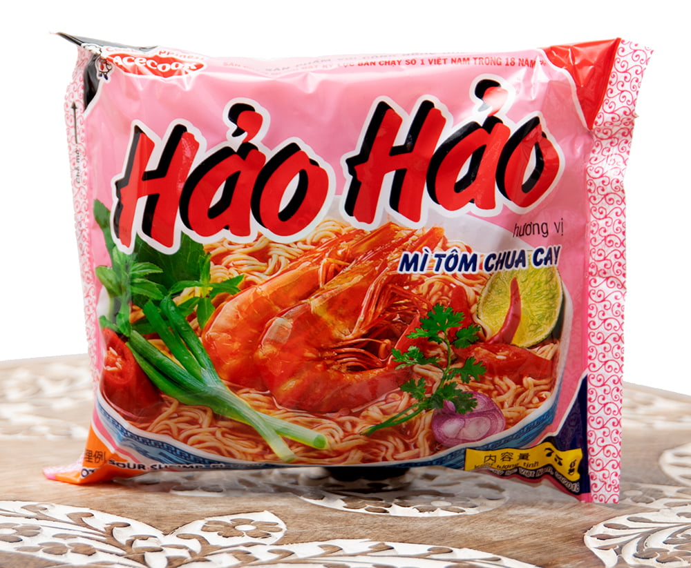 2000年から2018年にかけてベトナムで最も売れた即席袋麺として2018年9月にベトナム記録会から認定された、まさにベトナムの国民的ヌードルとも言えるインスタント麺です。ハオハオ トムチュアカイとは、海老の旨味に爽やかな酸味・辛味が効いた旨辛スープが特徴のベトナムの即席麺です。