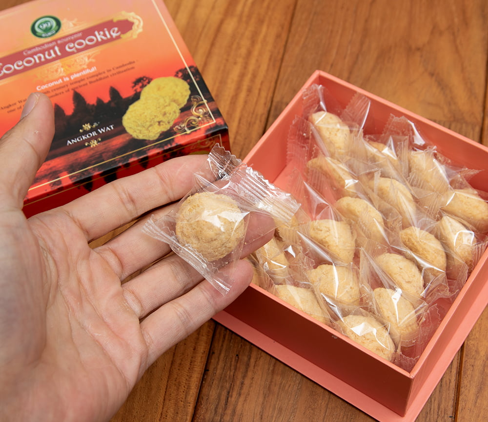 箱の中には小さな袋に入ったココナッツクッキーがたくさん入っています。個包装されているので、職場や学校でちょっとづつ食べるのにピッタリです。パッケージはシュリンク包装がされていて、外側に食品表示シールが貼ってあるので、シュリンク包装を剥がせば完全にカンボジアからのお土産に変身します。