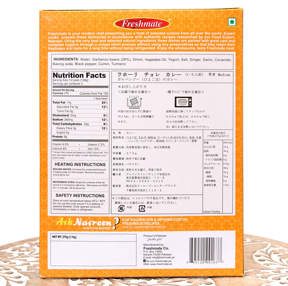 ラホーリ チョレ カレー - ガルバンゾー(ひよこ豆)のカレー - Lahori Choley 【Freshmate】 x 6個
