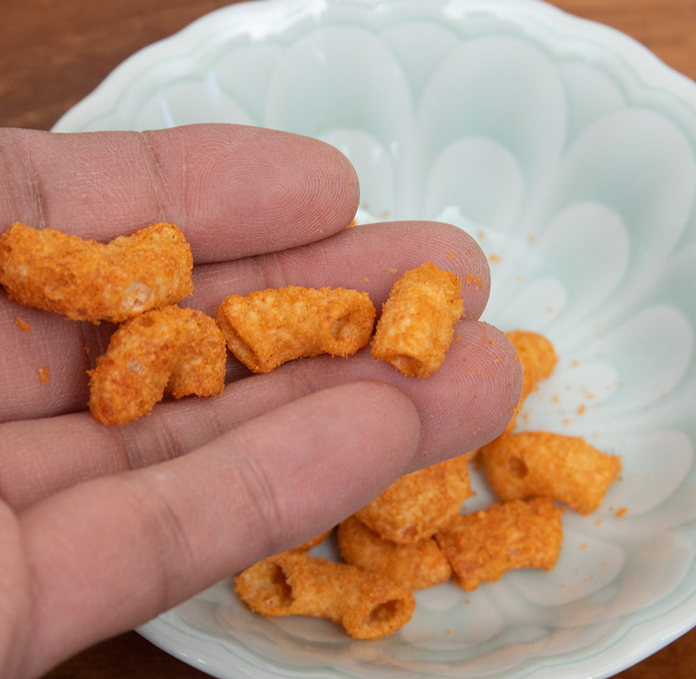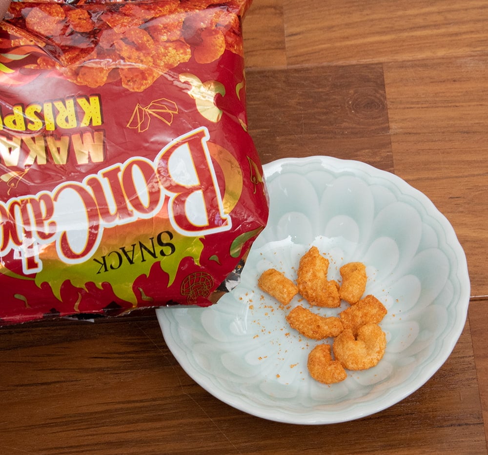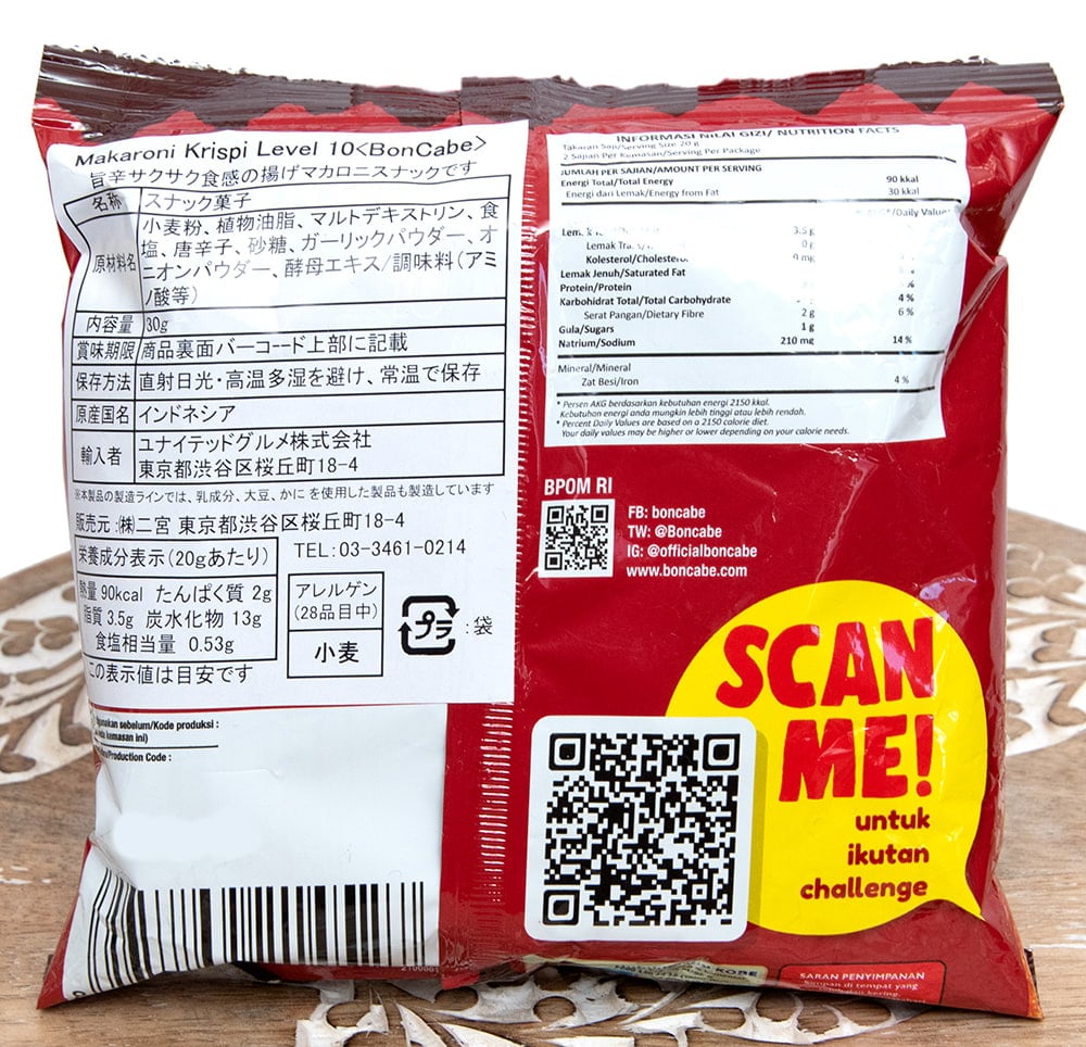 インドネシアからやってきた旨辛唐辛子ボンチャベが、今度はカリカリのマカロニになりました。真っ赤なパッケージがなんとも辛そうで、レベル10と書いてあります!!!旨辛唐辛子ボンチャベと言えば、チリフレークにオニオン、胡椒等の旨さをを配合し、チリフレークの香ばしさが辛さの中に旨味を引き出した唐辛子として人気です。