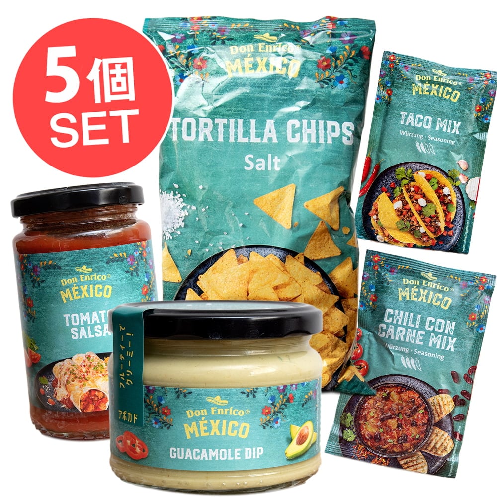 こちらだけでメキシコのお味をお楽しみ頂ける便利なセットです。チップス、ワカモレ、サルサソースなど5種類がセットになっています。■ドン エンリコはおしゃれで楽しいメキシカンブランド!