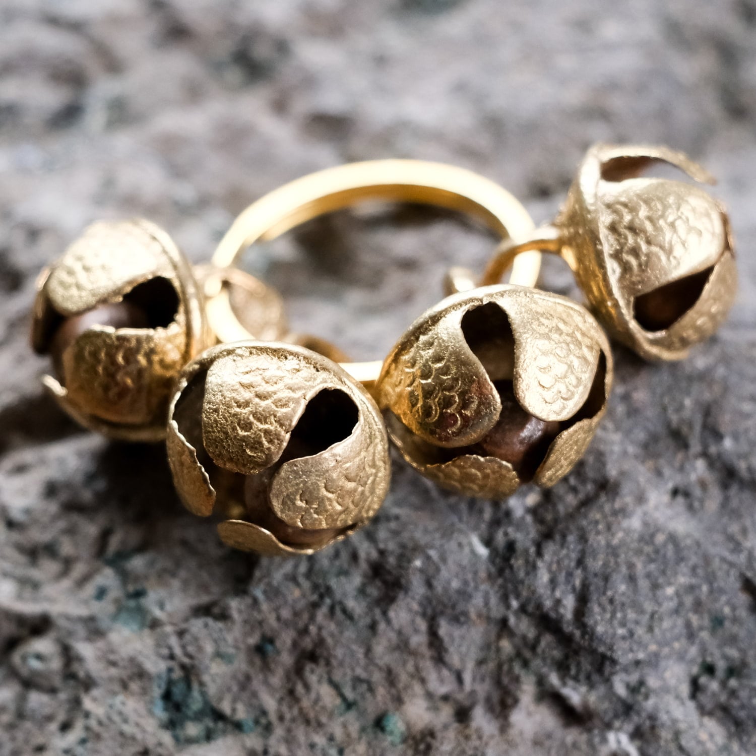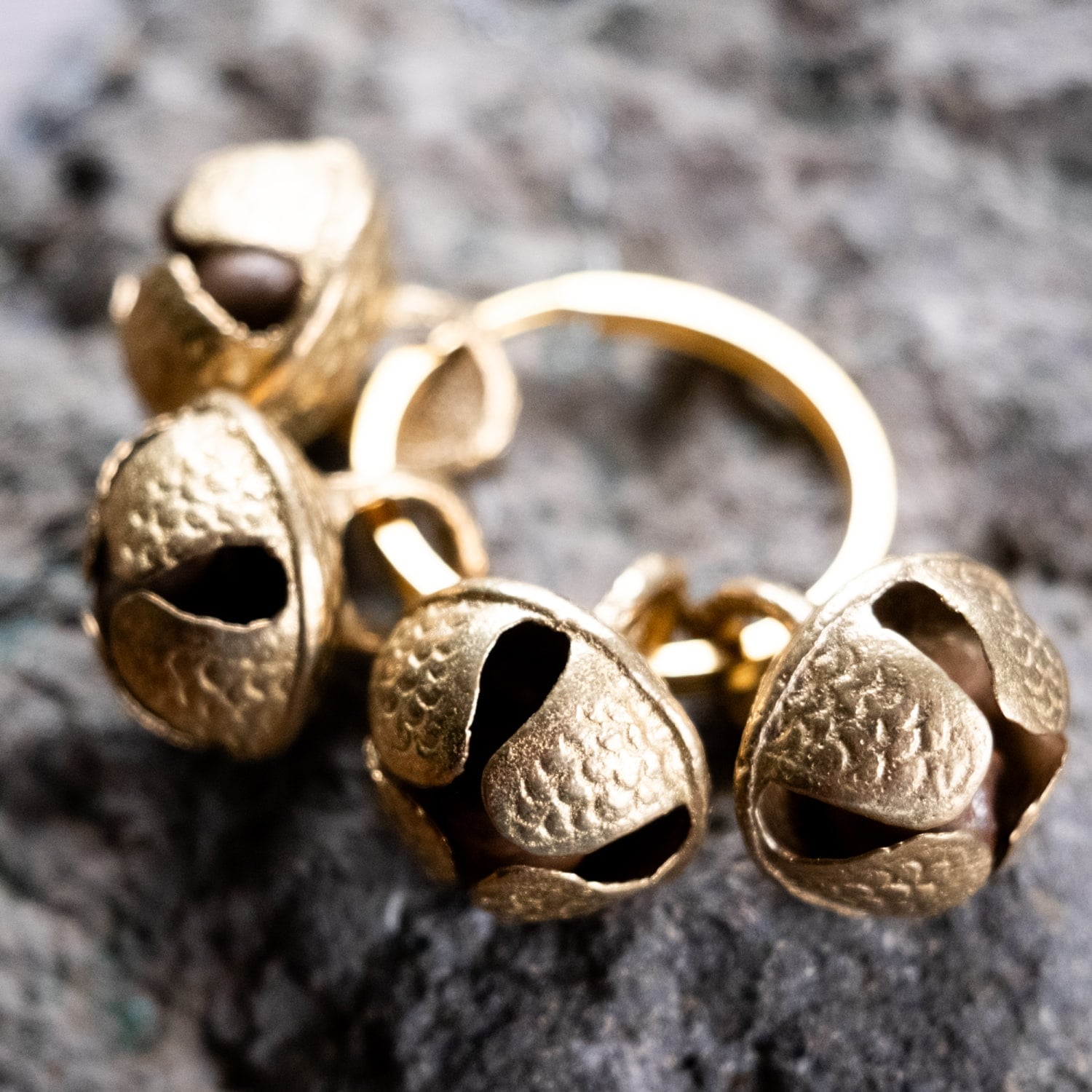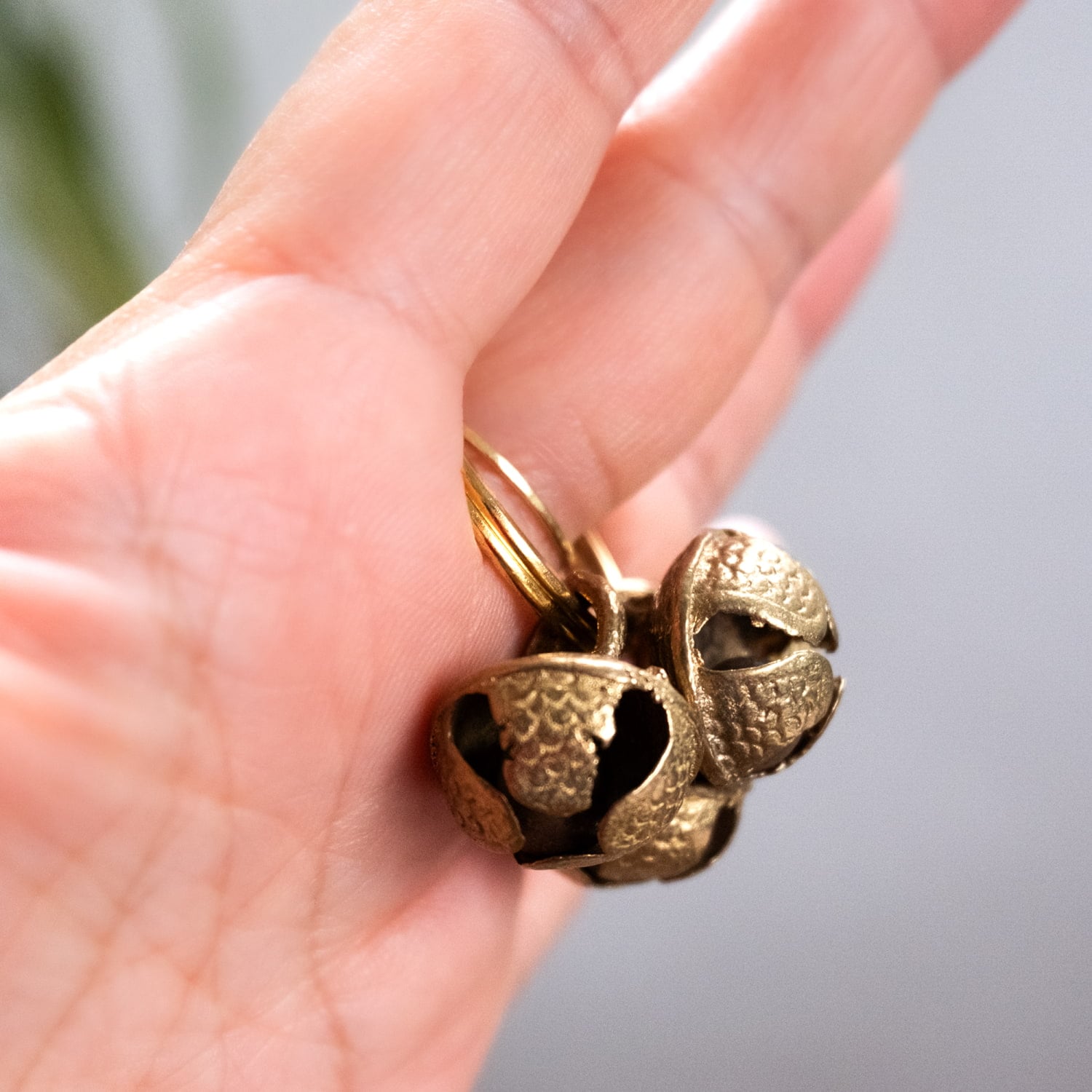 インド独特のブラス製の小さな鈴「グングル」。紐にたくさん並べたものを脚に巻き付けてリズム楽器としたり、バッグなどの装飾に使われたりさまざまな使い方をされています。こちらはそんなグングルをキーリングにアレンジしたもの。