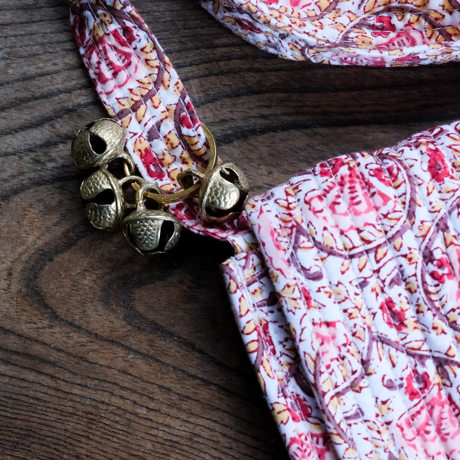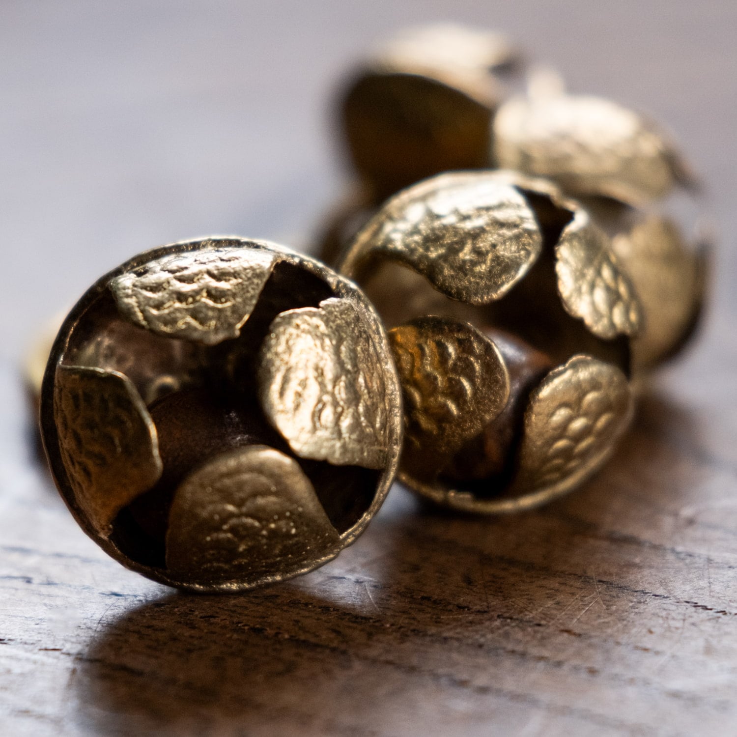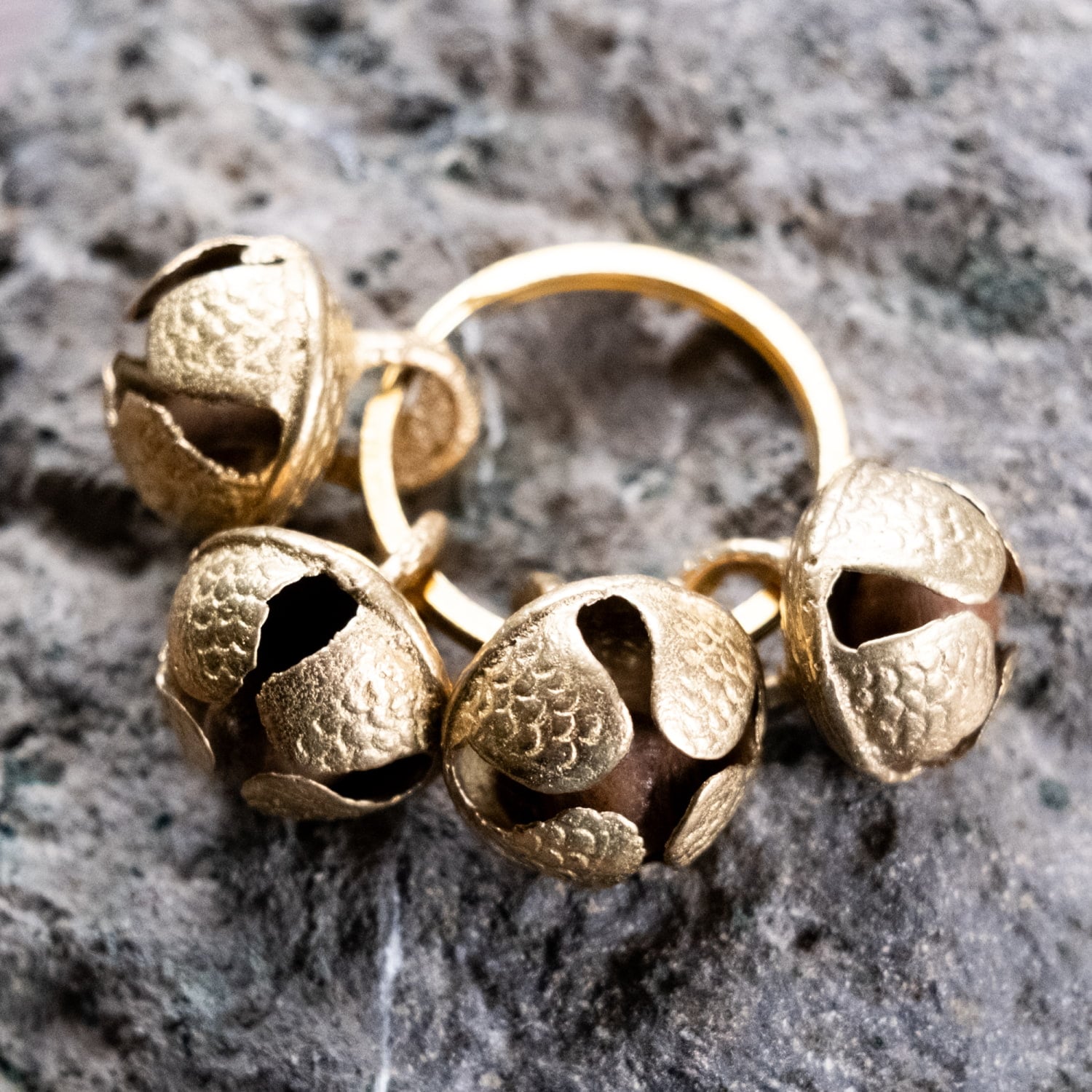 インド独特のブラス製の小さな鈴「グングル」。紐にたくさん並べたものを脚に巻き付けてリズム楽器としたり、バッグなどの装飾に使われたりさまざまな使い方をされています。こちらはそんなグングルをキーリングにアレンジしたもの。