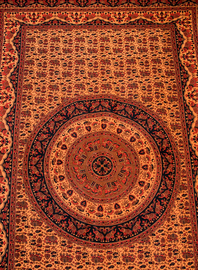 大きな布にとても丁寧に、インド伝統の唐草柄やマンダラ柄、象さんや、お花などがプリントされているので、こちら1枚をお部屋に飾るだけでアジアンなお部屋に大変身!