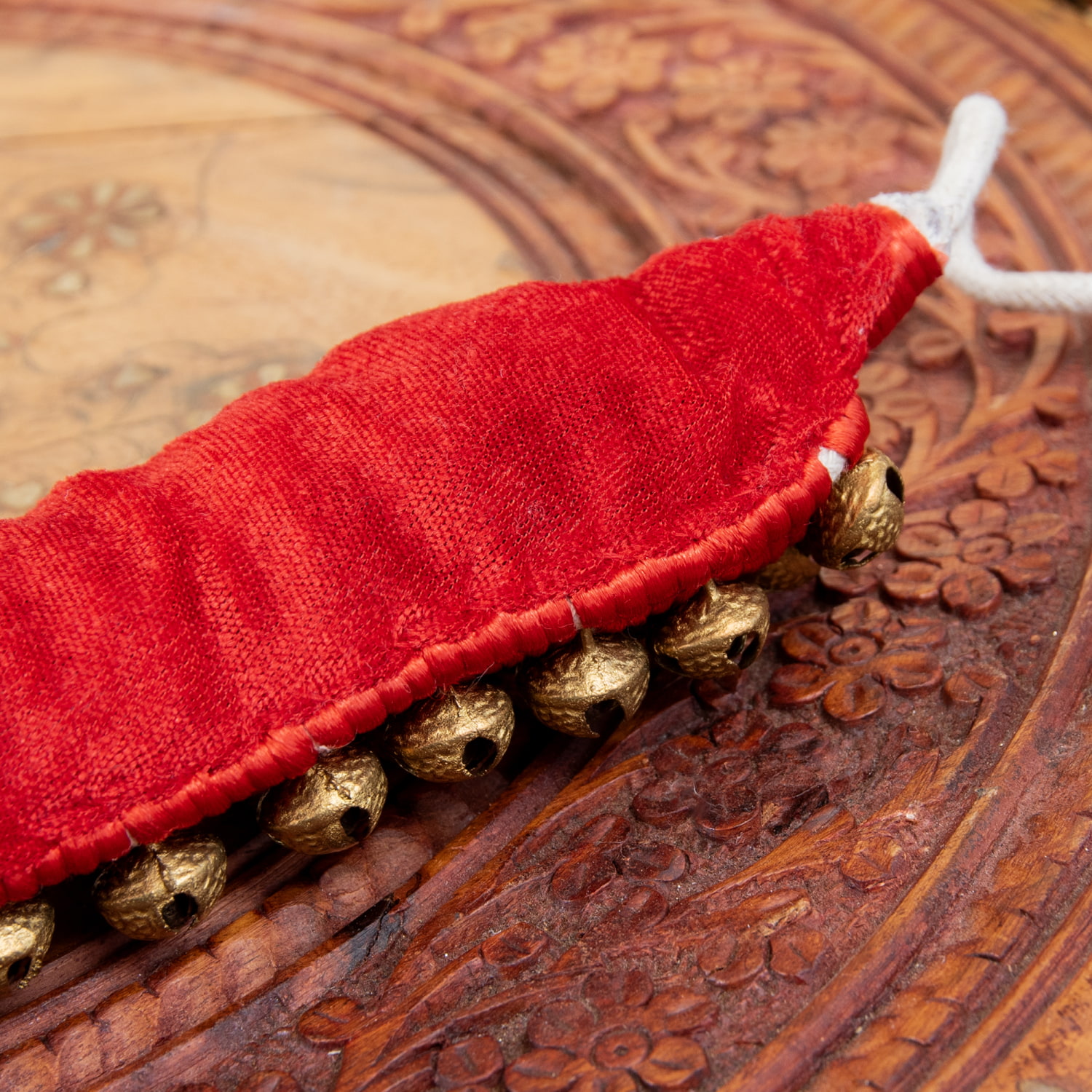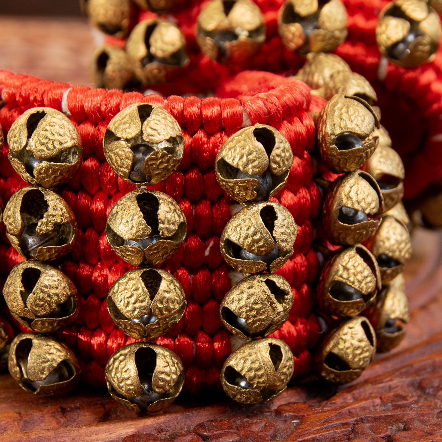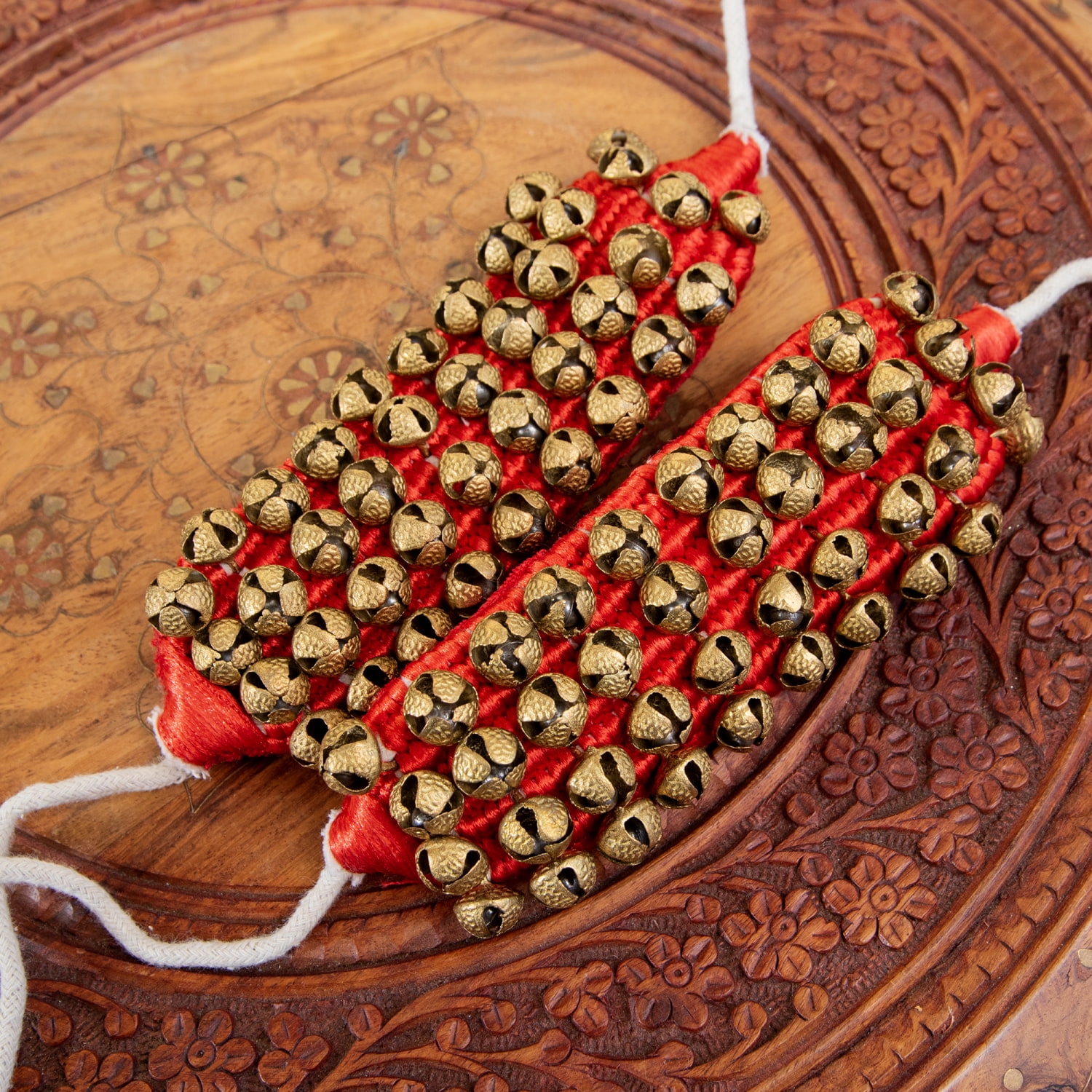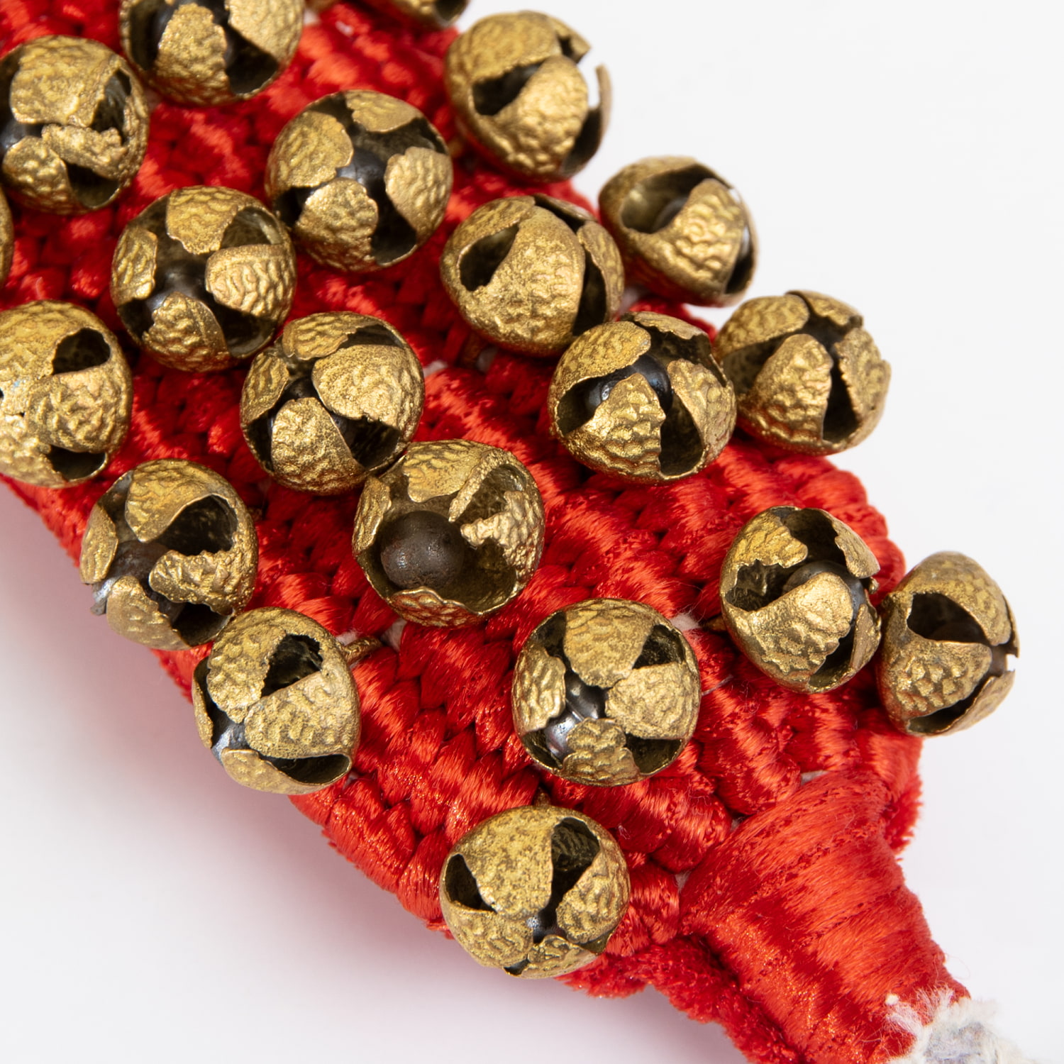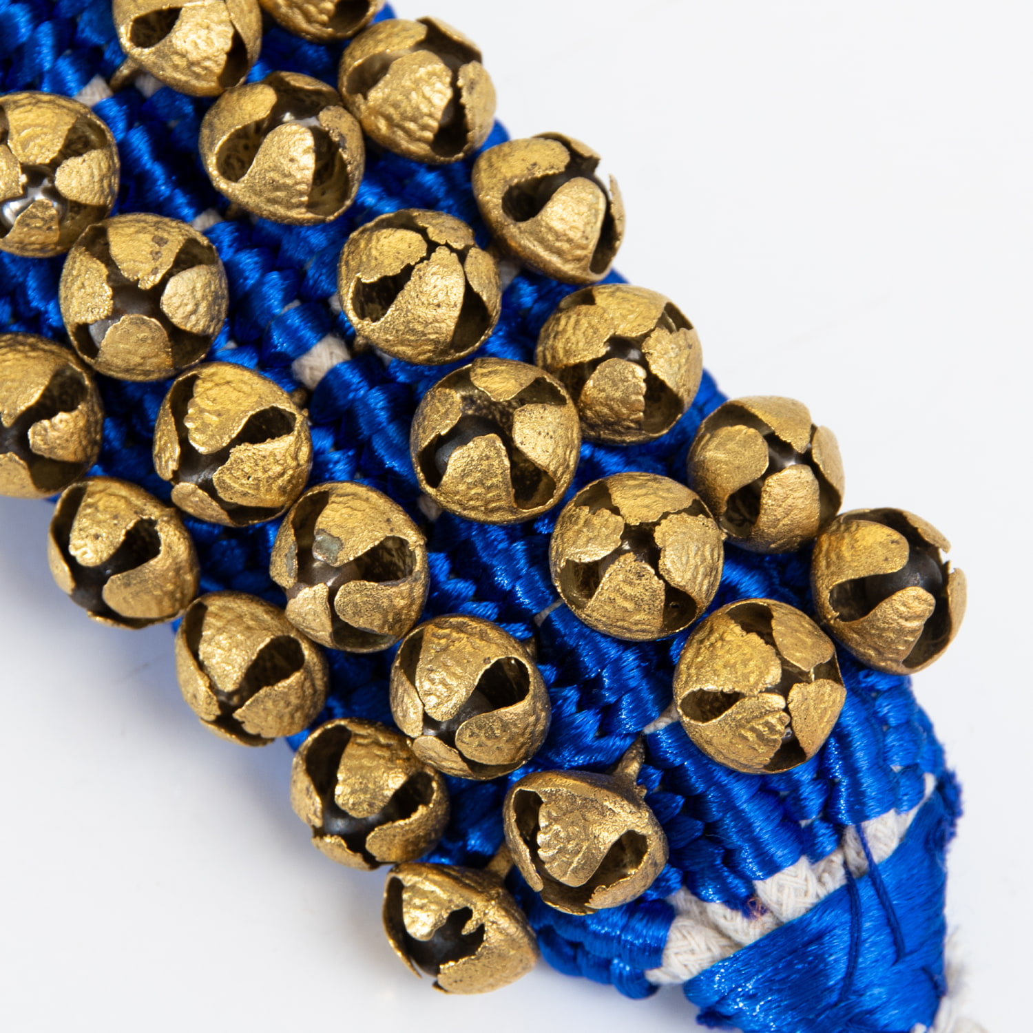 こちらは、たっぷり4列の鈴が配された太めのタイプ。鈴の数が多いので音もより分厚く、豊かに鳴り響きます。長時間踊っても足に傷がつかないよう、パッド付きになっていて、裏面はベルベットで覆われております。結ぶための紐は滑りにくいコットン製で、簡単には取れないように本体と一緒に編み込まれています。
