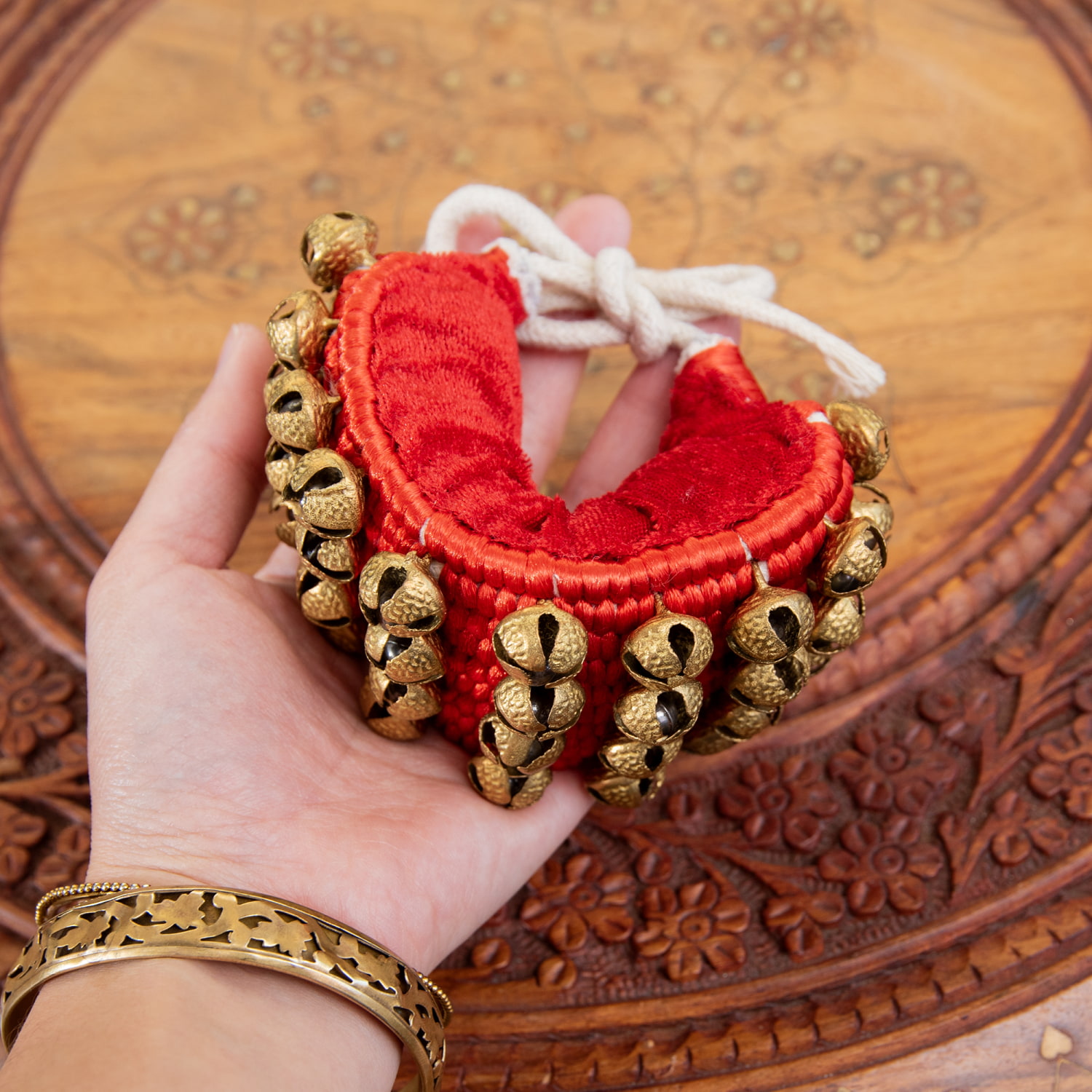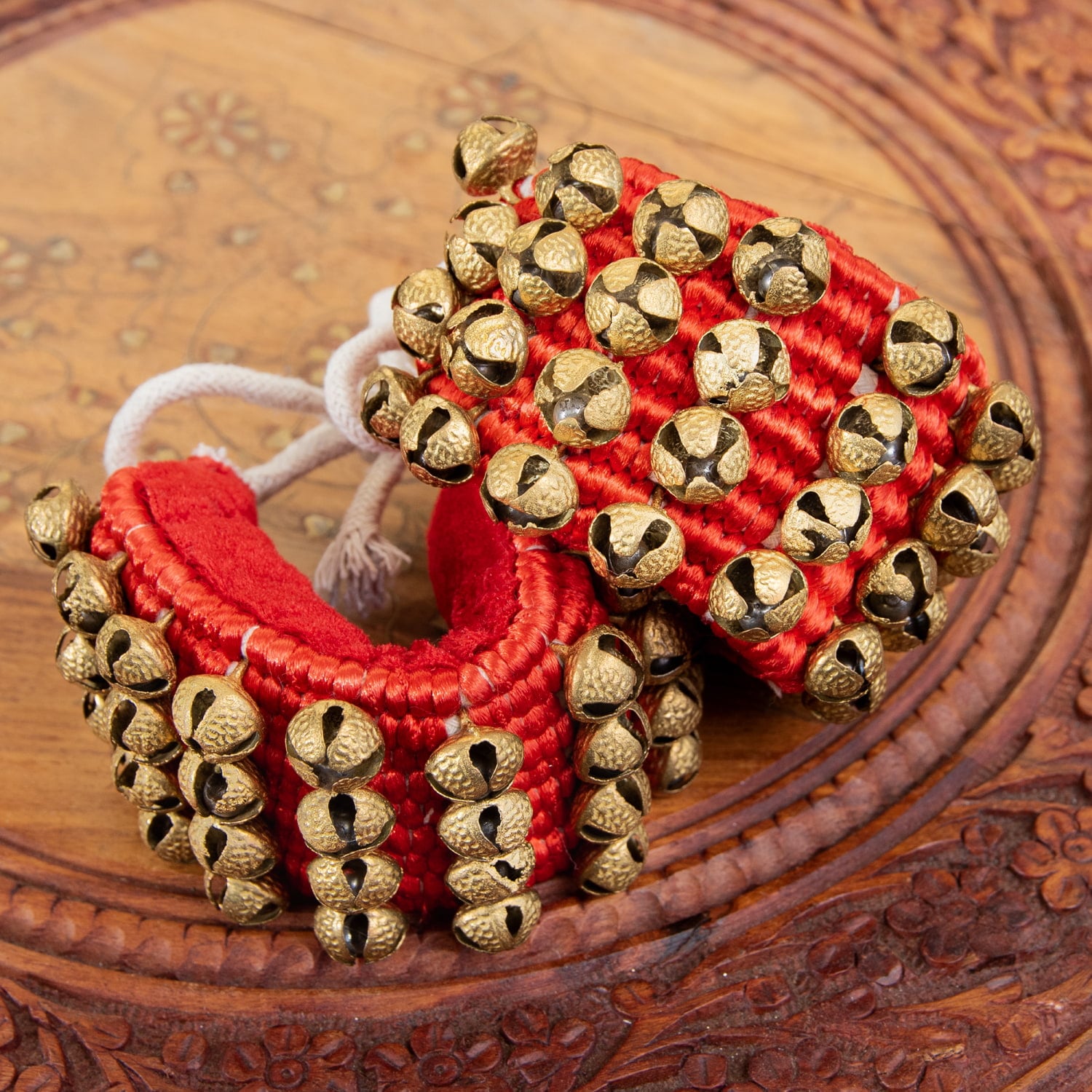 こちらはインド舞踊などで使われる、足につける鈴です。舞踊やダンスなどの時に、ささっと巻いて踊ると、足元からシャンシャンと涼やかな音があなたのリズムと一緒にやってきます。ダンスや舞踊だけでなく、劇やステージなど、踊りに音を合わせたい時に便利な紐タイプの鈴です。
