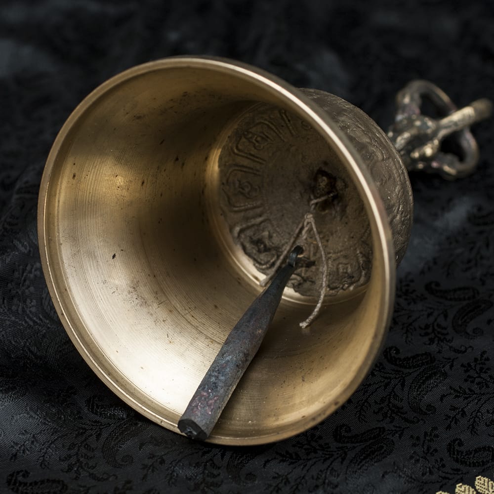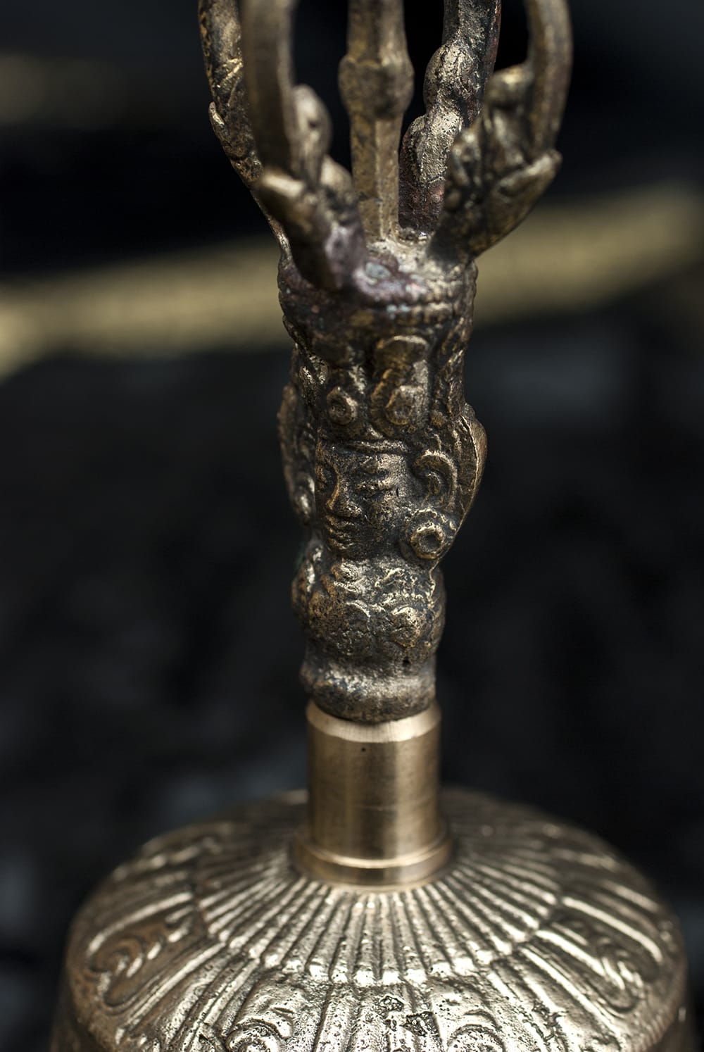 密教で、煩悩を破壊する武器と考えられている「金剛杵(ヴァジュラ)」とセットで用いられる「金剛鈴(ガンター)」。儀式の時には、右手に金剛杵、左手にこの金剛鈴を持ちます。金剛杵は男性原理である「方便(他者を救済する力)」・金剛鈴は女性原理の「智恵(真理)」を象徴し、その両方を手にすることは、それらの合一を意味すると考えられています。