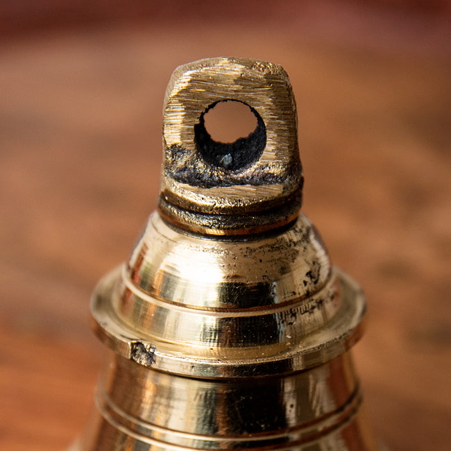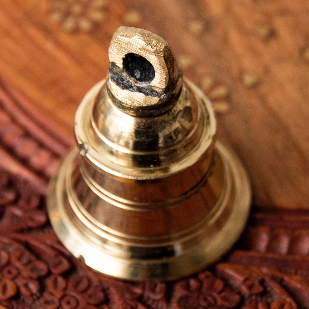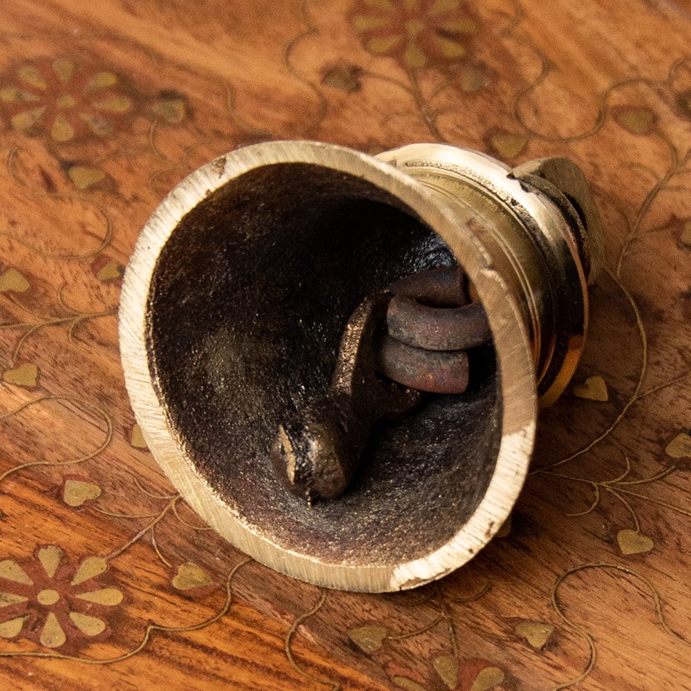 こちらは、インドの聖地バラナシで祭礼用として使用されているハンドベルです。真鍮を型に入れて削りだした、素朴な風合いがインドらしい一品です。音色は澄んでいて涼やかな感じです。