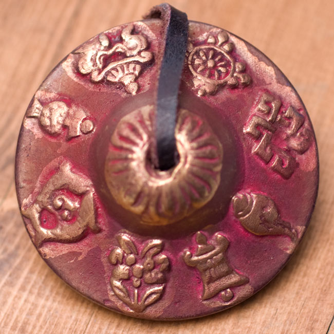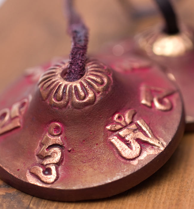 ただ、インドのマンジーラが基本的にシンプルなのに対し、ディンシャは中国の影響を受けたと思われる吉兆柄や、チベットの影響を受けたと思われるチベット仏教の真言オンマニペメフムや、ドラゴンなどが彫られ、より魅力的なアイテムに仕上がっています。こちらは、ディンシャに色を施し柄の部分が金色に輝く重厚な仕上がりの一品。