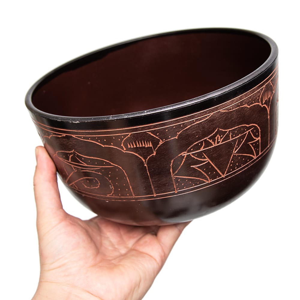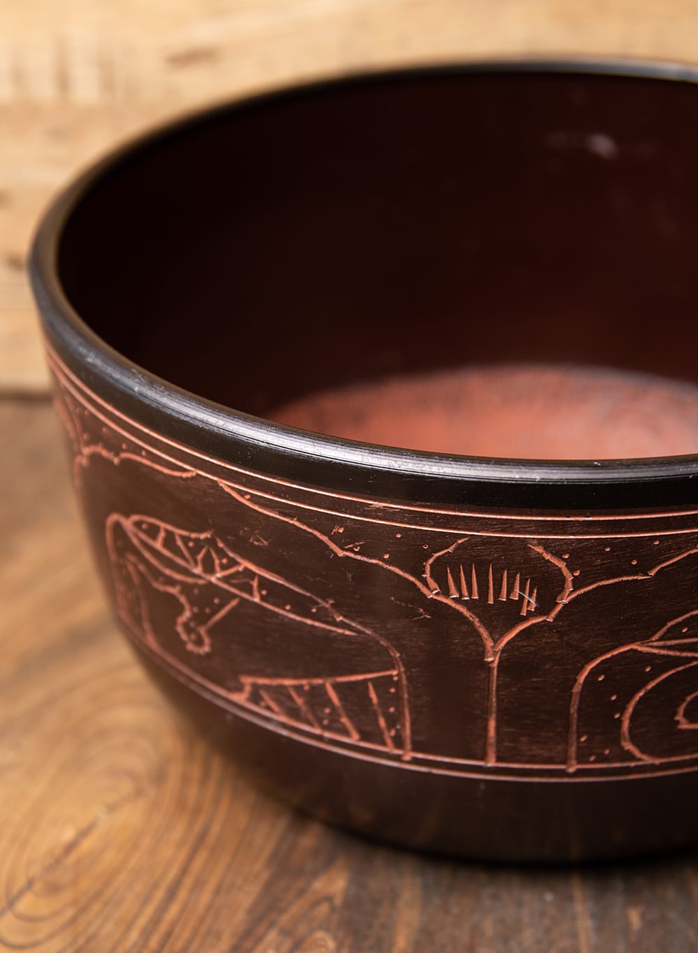 鳴らしやすさと装飾が特徴的な、ライトウェイトシンギングボウル。このシンギングボウルは楽器としての性能と、見た目の美しさを兼ね備えております。叩いた時の音色もいいですが、特に回して演奏する際の鳴らしやすさがとっても良いです。シンギングボウルによっては、縁の凹凸があり、音を大きくしていくと反発もバチが強い力で弾かれてしまいます。