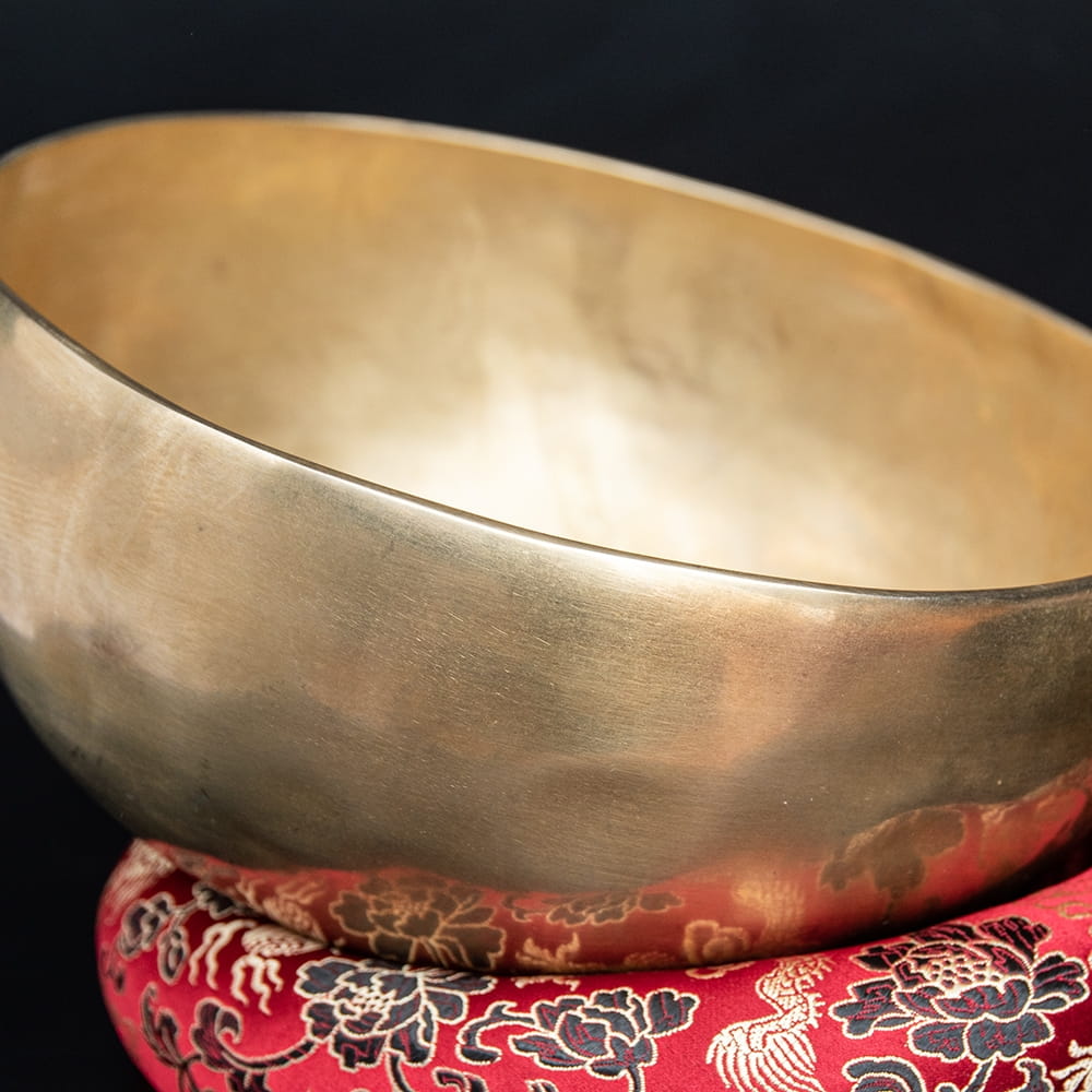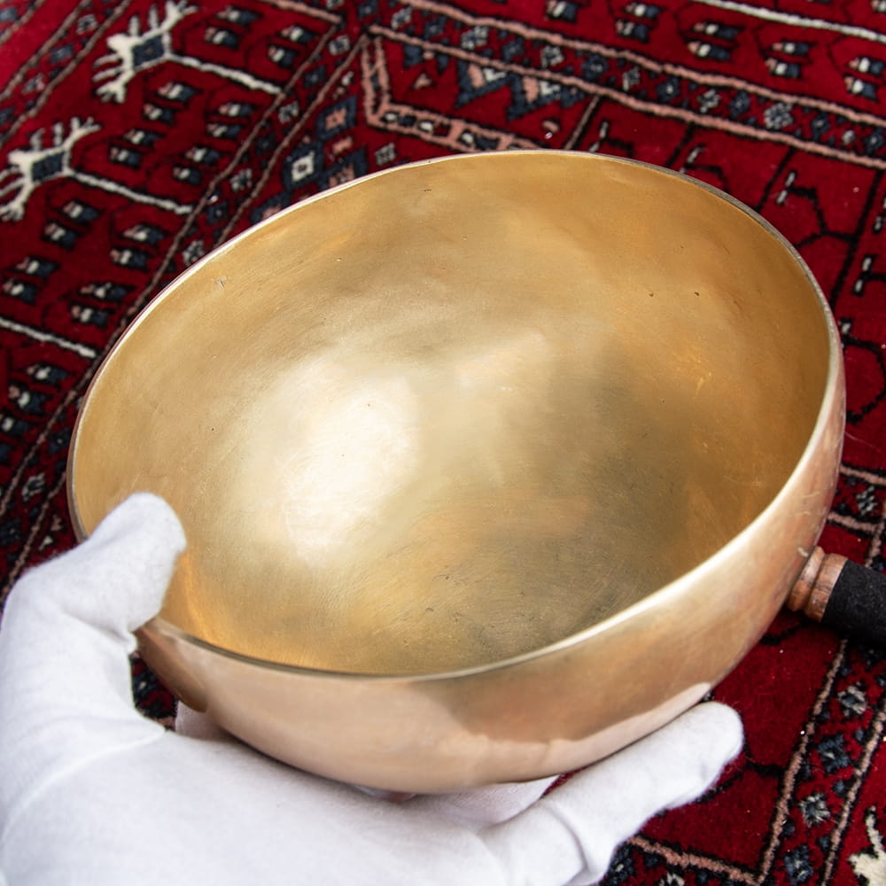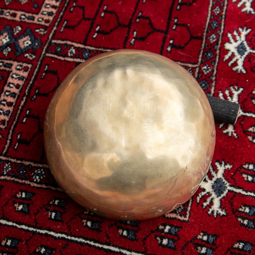 ずっと憧れていた、21cmほどの大きなシンギングボウルをこちらで買わせていただきました。一点もののアンティックということで、歴史を感じながら大切に使わせていただいています。フェルトスティックも同時に購入したので、付属のスティックと使い分けることで、異なる音色を楽しんでいます。部屋に置くと深みのある黄金の輝きを放っていて、存在感があります。粗末に扱うことはできないなと感じます。歴史を感じます。別売りの大きなフェルトスティックで叩くとポーン、という低い、いい音がします。付属の硬めのスティックで叩くと、カーン、というような、お寺などで聞くようなあの金属的な音がしました。響きの余韻が長く、叩いた後顔の目の前にボウルを近づけると、音を大きく感じ、深い響きを感じられます。いつ音が消えるのかと耳をすましている間に心が無になって落ち着いてきます。いつかYouTubeで見た、シンギングボウルの振動を体に感じるネパールの治療法のようなものもやってみたかったので、横になって、お腹に乗せて鳴らして、振動を感じて楽しんだりしています。変わった音楽を作ったりもするので、そっちでも活用していきたいです。この度はいいものとの出会いをありがとうございました。一生物だと思うので、大切にしていきます。