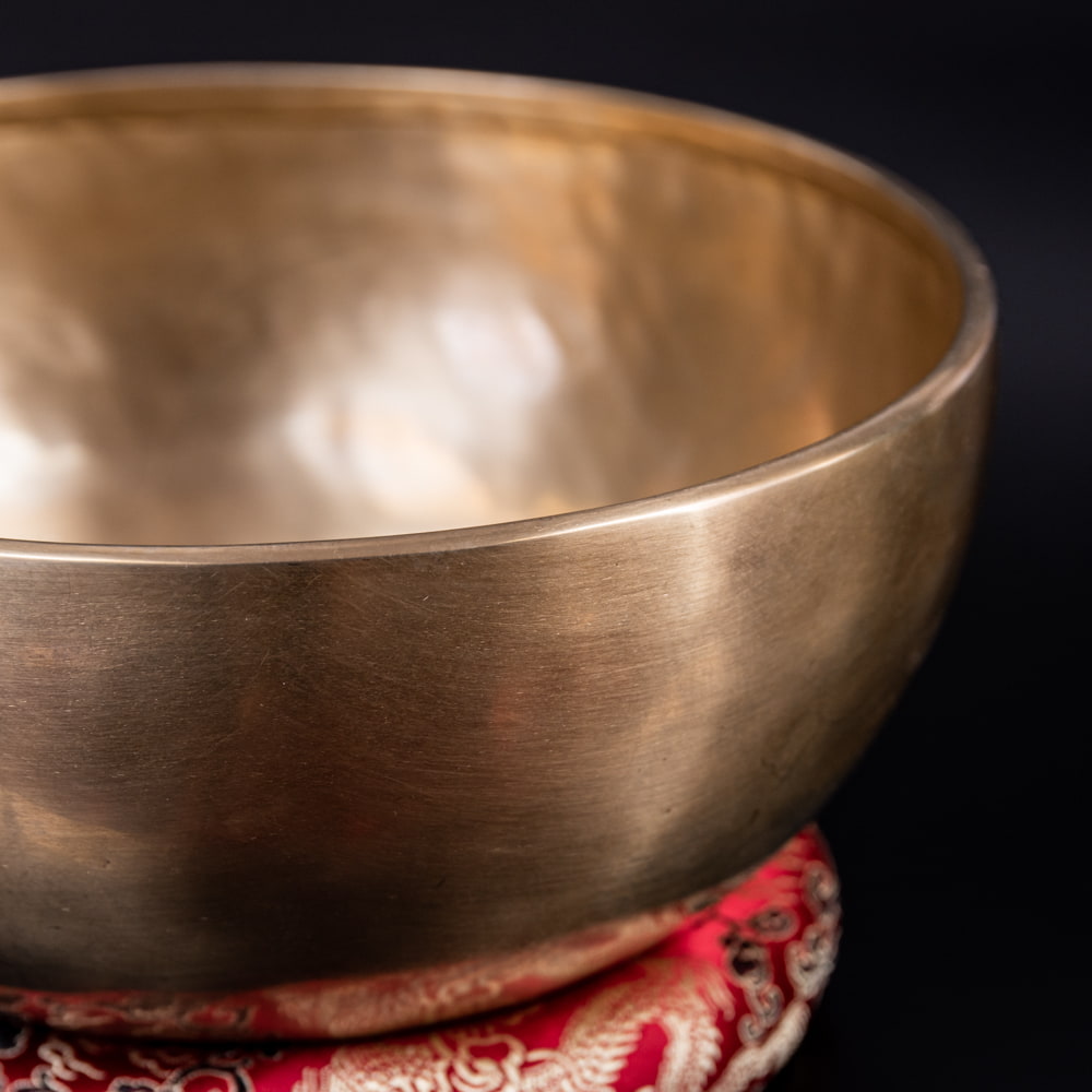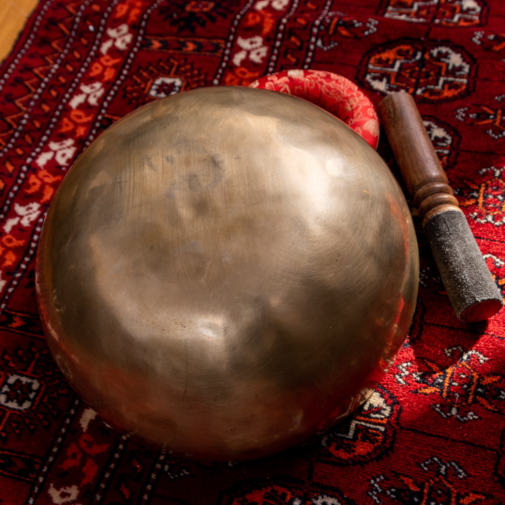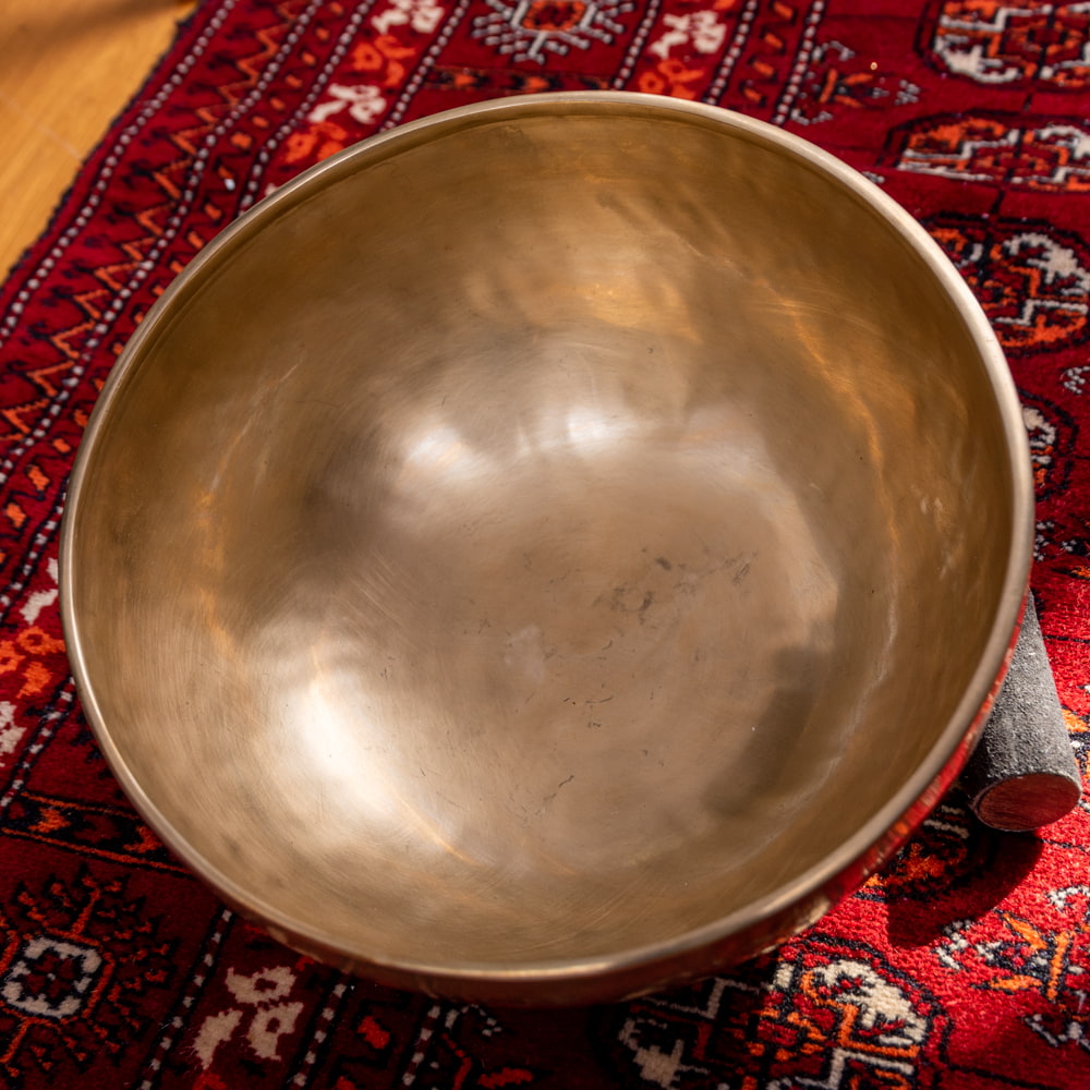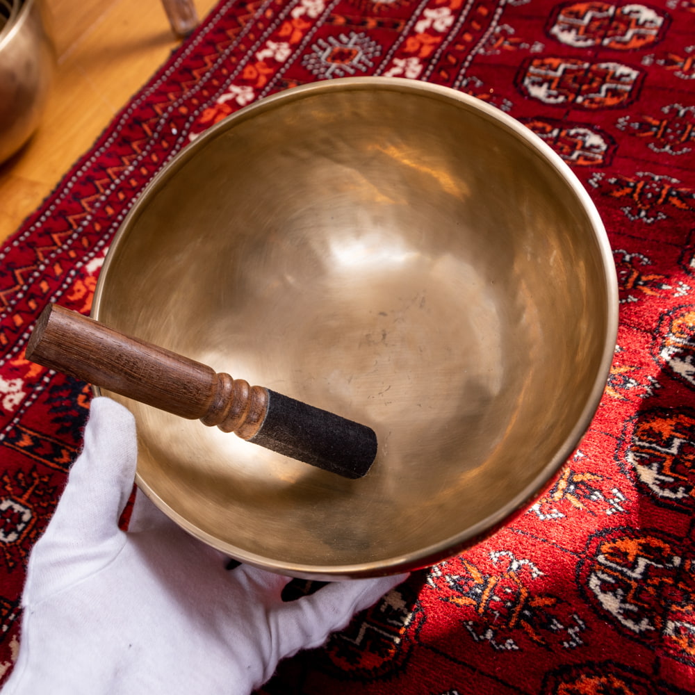 ずっと憧れていた、21cmほどの大きなシンギングボウルをこちらで買わせていただきました。一点もののアンティックということで、歴史を感じながら大切に使わせていただいています。フェルトスティックも同時に購入したので、付属のスティックと使い分けることで、異なる音色を楽しんでいます。部屋に置くと深みのある黄金の輝きを放っていて、存在感があります。粗末に扱うことはできないなと感じます。歴史を感じます。別売りの大きなフェルトスティックで叩くとポーン、という低い、いい音がします。付属の硬めのスティックで叩くと、カーン、というような、お寺などで聞くようなあの金属的な音がしました。響きの余韻が長く、叩いた後顔の目の前にボウルを近づけると、音を大きく感じ、深い響きを感じられます。いつ音が消えるのかと耳をすましている間に心が無になって落ち着いてきます。いつかYouTubeで見た、シンギングボウルの振動を体に感じるネパールの治療法のようなものもやってみたかったので、横になって、お腹に乗せて鳴らして、振動を感じて楽しんだりしています。変わった音楽を作ったりもするので、そっちでも活用していきたいです。この度はいいものとの出会いをありがとうございました。一生物だと思うので、大切にしていきます。