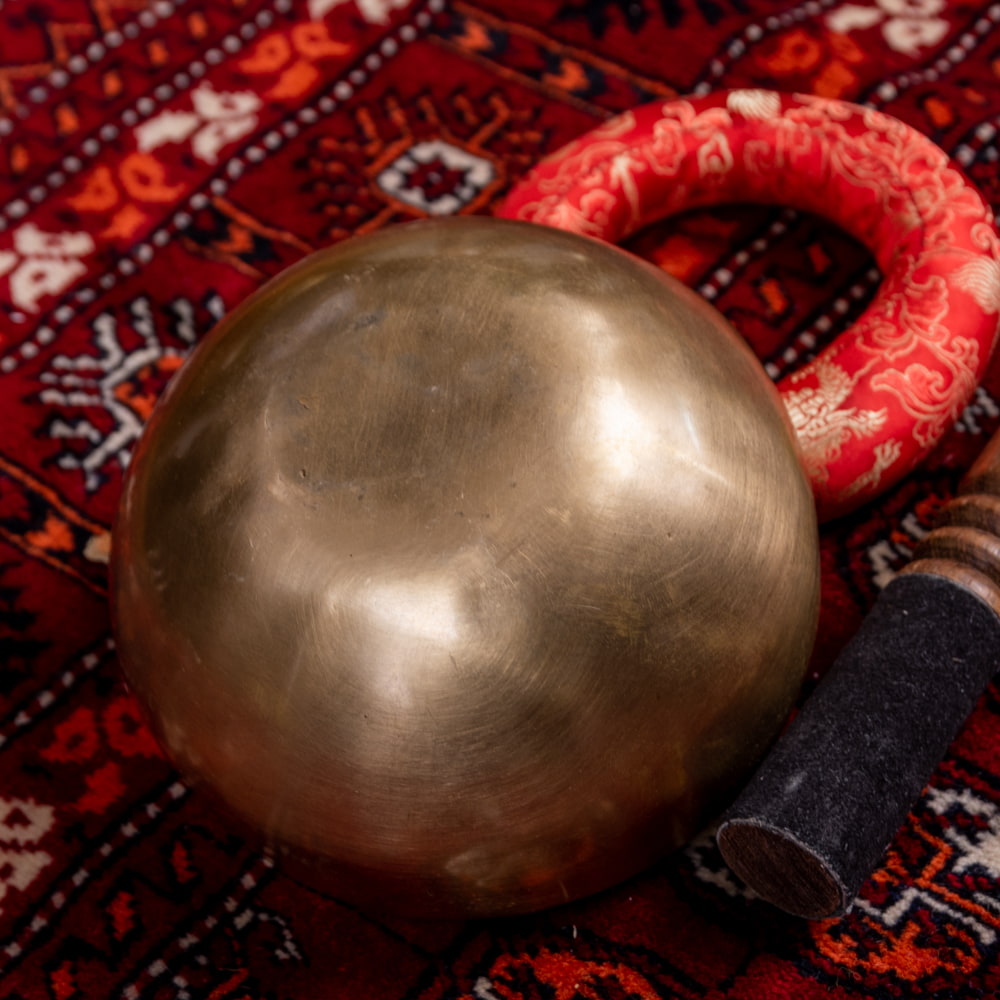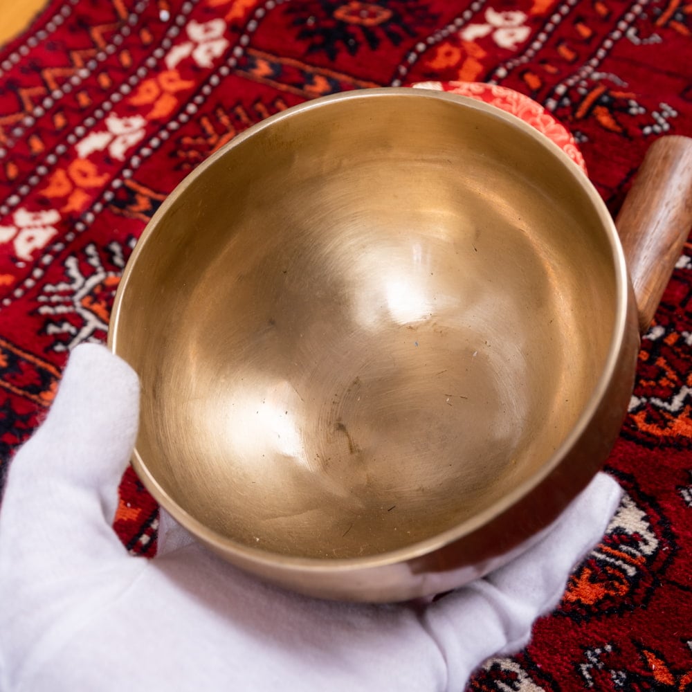ずっと憧れていた、21cmほどの大きなシンギングボウルをこちらで買わせていただきました。一点もののアンティックということで、歴史を感じながら大切に使わせていただいています。フェルトスティックも同時に購入したので、付属のスティックと使い分けることで、異なる音色を楽しんでいます。部屋に置くと深みのある黄金の輝きを放っていて、存在感があります。粗末に扱うことはできないなと感じます。歴史を感じます。別売りの大きなフェルトスティックで叩くとポーン、という低い、いい音がします。付属の硬めのスティックで叩くと、カーン、というような、お寺などで聞くようなあの金属的な音がしました。響きの余韻が長く、叩いた後顔の目の前にボウルを近づけると、音を大きく感じ、深い響きを感じられます。いつ音が消えるのかと耳をすましている間に心が無になって落ち着いてきます。いつかYouTubeで見た、シンギングボウルの振動を体に感じるネパールの治療法のようなものもやってみたかったので、横になって、お腹に乗せて鳴らして、振動を感じて楽しんだりしています。変わった音楽を作ったりもするので、そっちでも活用していきたいです。この度はいいものとの出会いをありがとうございました。一生物だと思うので、大切にしていきます。