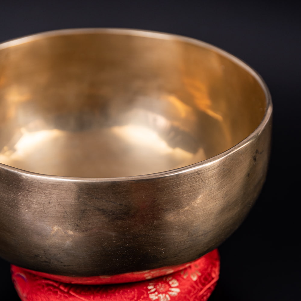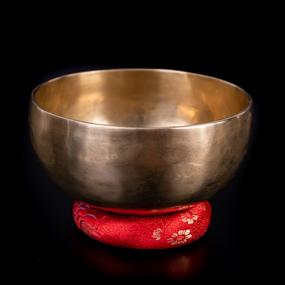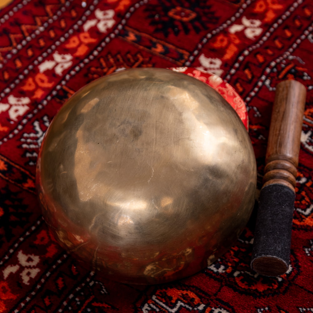 ずっと憧れていた、21cmほどの大きなシンギングボウルをこちらで買わせていただきました。一点もののアンティックということで、歴史を感じながら大切に使わせていただいています。フェルトスティックも同時に購入したので、付属のスティックと使い分けることで、異なる音色を楽しんでいます。部屋に置くと深みのある黄金の輝きを放っていて、存在感があります。粗末に扱うことはできないなと感じます。歴史を感じます。別売りの大きなフェルトスティックで叩くとポーン、という低い、いい音がします。付属の硬めのスティックで叩くと、カーン、というような、お寺などで聞くようなあの金属的な音がしました。響きの余韻が長く、叩いた後顔の目の前にボウルを近づけると、音を大きく感じ、深い響きを感じられます。いつ音が消えるのかと耳をすましている間に心が無になって落ち着いてきます。いつかYouTubeで見た、シンギングボウルの振動を体に感じるネパールの治療法のようなものもやってみたかったので、横になって、お腹に乗せて鳴らして、振動を感じて楽しんだりしています。変わった音楽を作ったりもするので、そっちでも活用していきたいです。この度はいいものとの出会いをありがとうございました。一生物だと思うので、大切にしていきます。