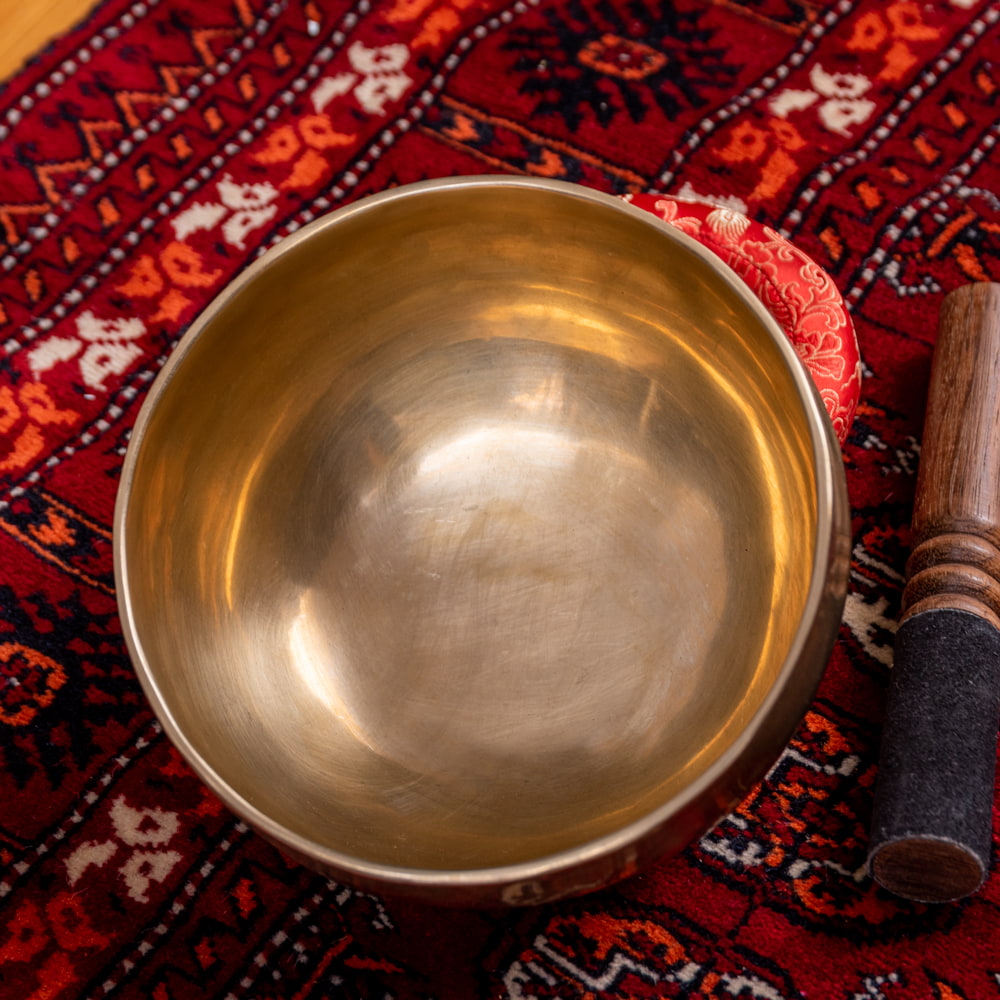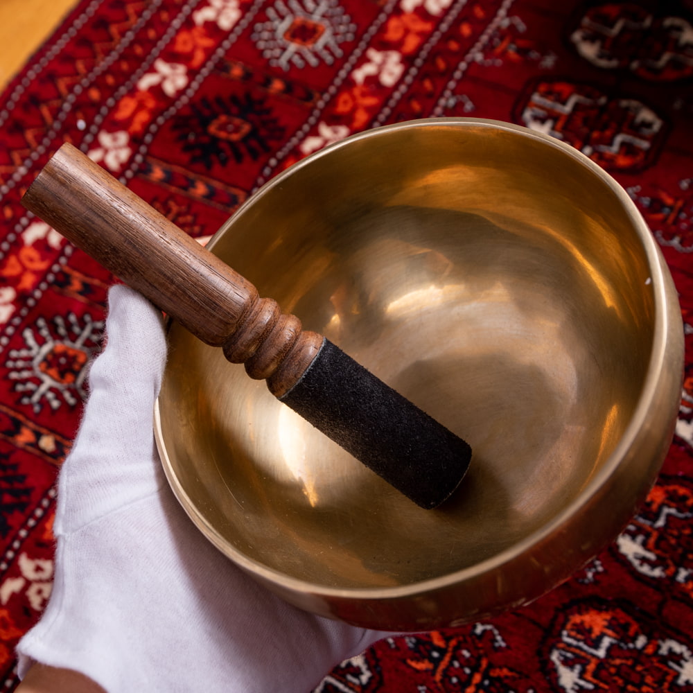 シンギングボウルの鳴らし方は木の棒で叩くか、ふちをこするだけの簡単な動作だけ。最初は音を出すのが難しいかもしれませんが慣れてくると不思議な倍音の周波数とあなたの脳が共鳴し、なんとも安らかな気持ちに。お香を炊いて月を見ながら静かに耳を澄ませる時などにとてもマッチすると思いますよ。また、こちらのシンギングボウルは、検品時に演奏した際の、実音を録音しております。左下の写真下部にある再生ボタンを押すと試聴が可能です。