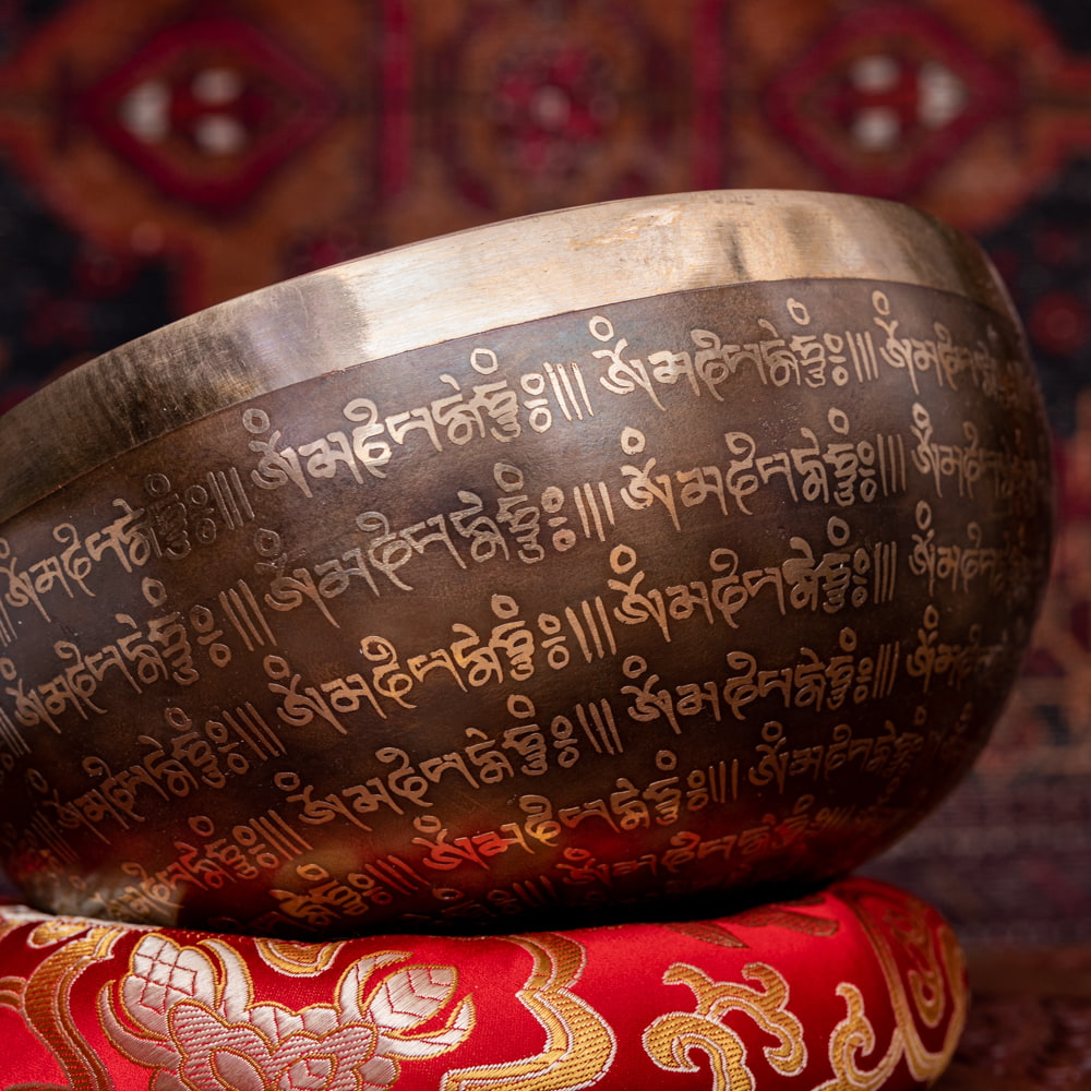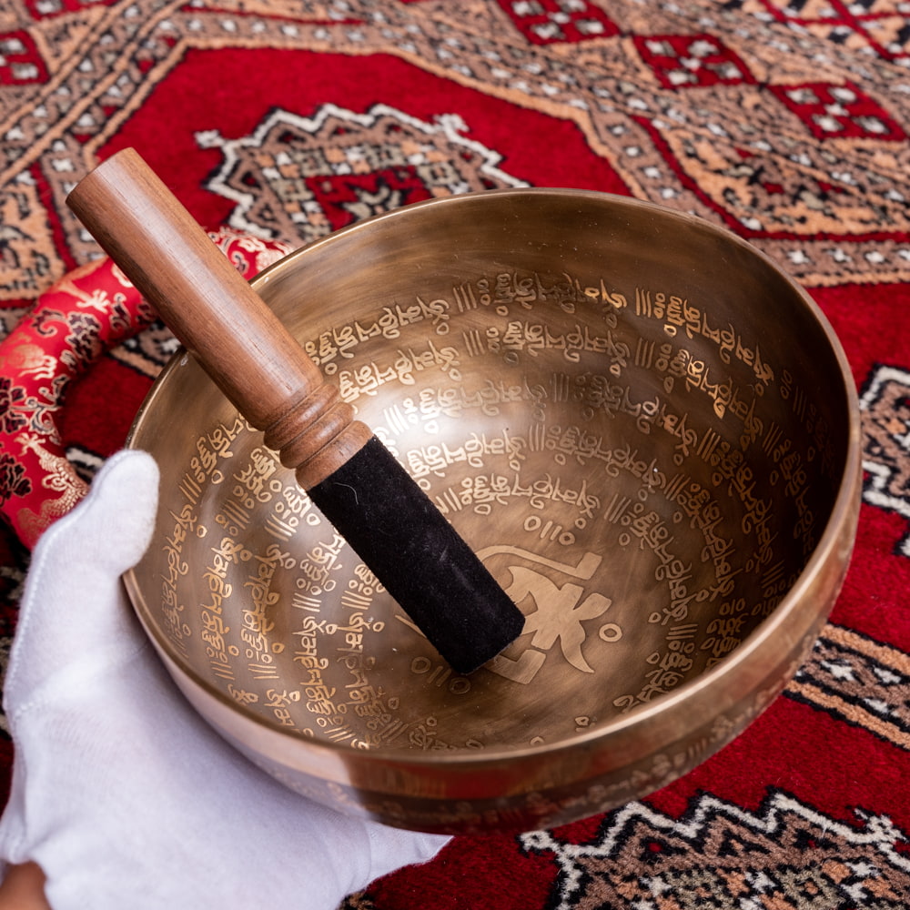 深みのある音色に加え特徴的なのが、職人によって手彫りされた美しい文様です。マントラや、ヴィシュヴァ・ヴァジュラ、アグニ、シャンカなどの吉兆柄に加え、ブッダなどが美しく彫られています。全ての柄をご覧いただけるよう、底面を含め写真に収めておりますので、是非御覧くださいませ。音色だけではなく、視覚的にも楽しく癒してくれる一品です。■シンギングボウルの鳴らし方について■